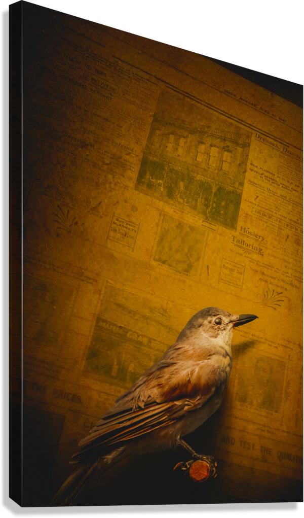 Vintage carrier bird Grey Shrike-thrush - Collurincincla harmonica shadowed beside old newspaper broadsheet. The messenger bird