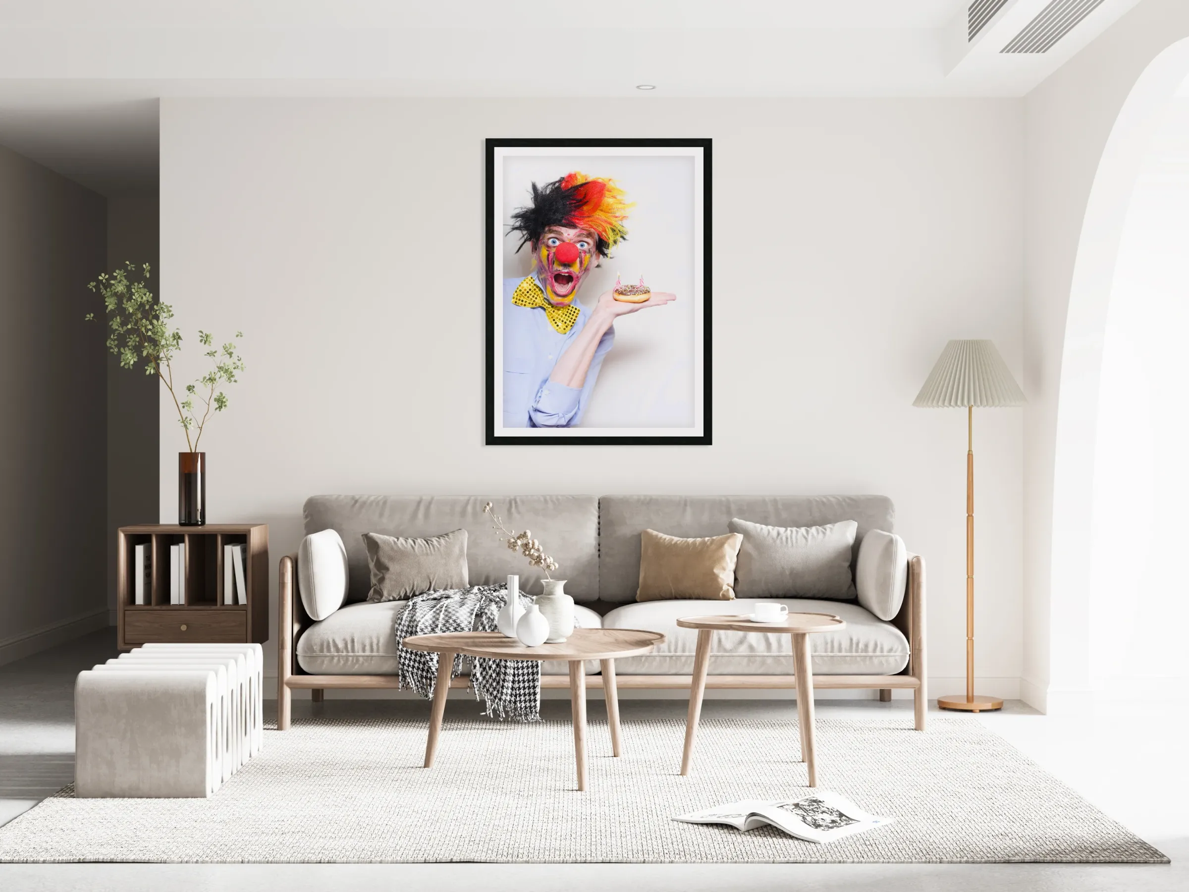 ABOUT THIS ARTWORK: SURPRISE HAPPY BIRTHDAY CLOWN HOLDING PARTY CAKE