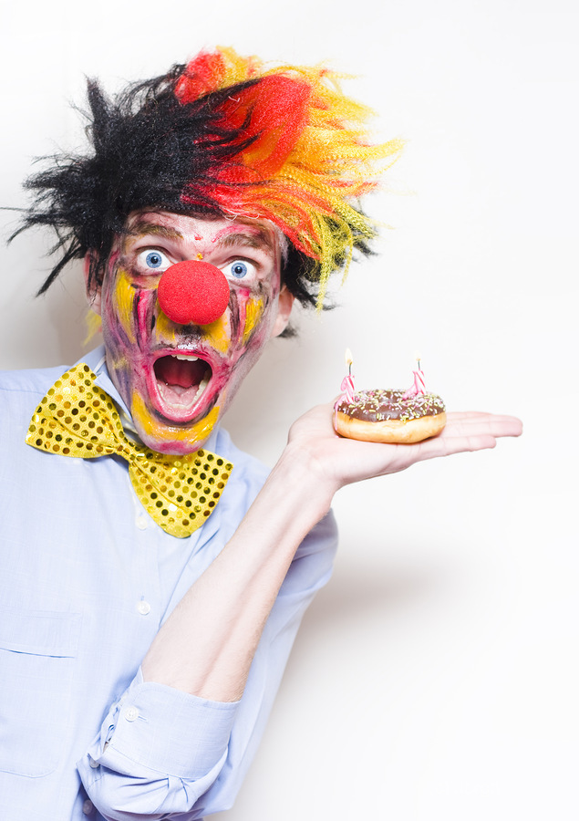 Shocked Happy Birthday Clown Holding Doughnut Party Cake With Two Candles During A Childs Birthday Party On Copy Space Background
