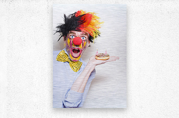 ABOUT THIS ARTWORK: SURPRISE HAPPY BIRTHDAY CLOWN HOLDING PARTY CAKE