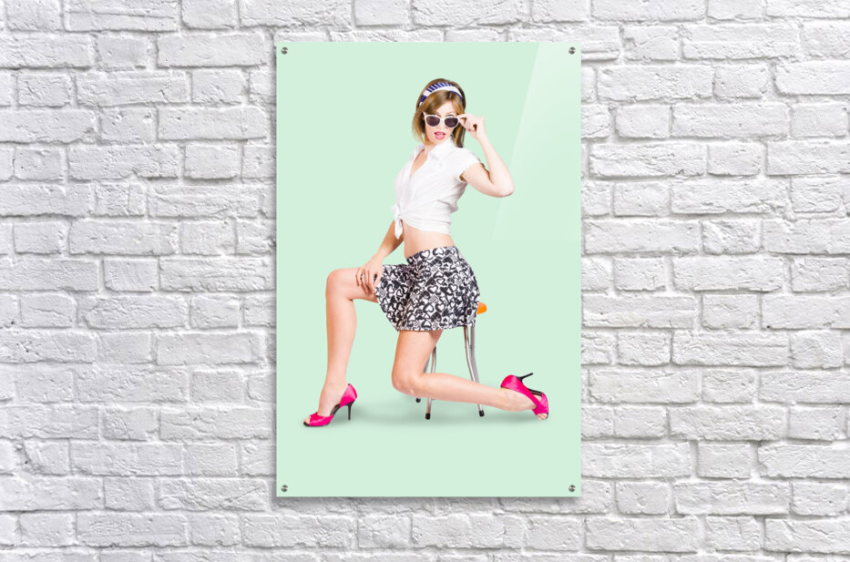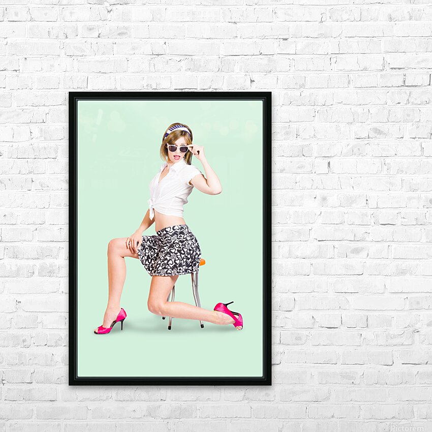 Sexy brunette pin up girl in pink retro fashion Frame print