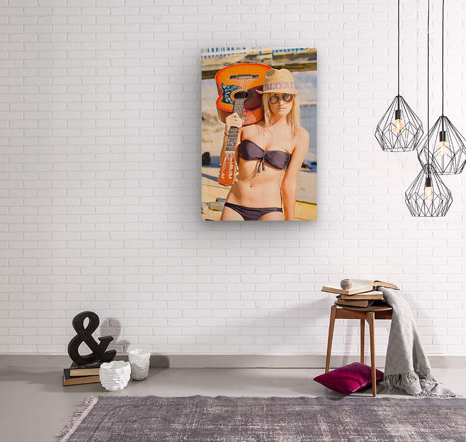 Young Sassy Female Performing Artist In Bathing Costume Dark Glasses And Summer Fashion Hat Holding Acoustic Guitar At An Oceanic Port