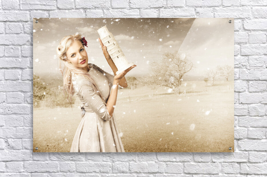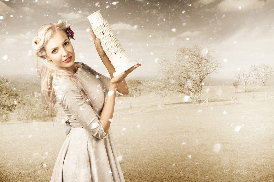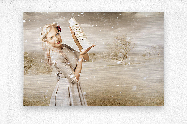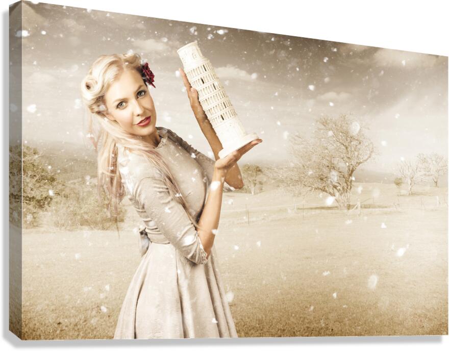 Elegant Vintage Woman Standing In The Winter Snow While Holding A Piece Of Holiday History In The Form Of A Famous Monument While Dreaming Of A Europe...[+]