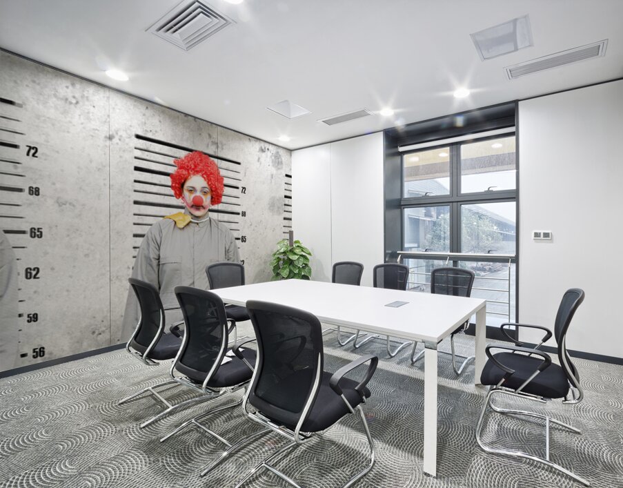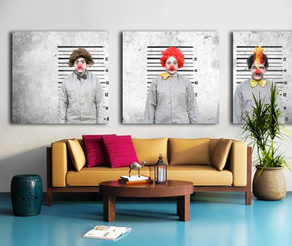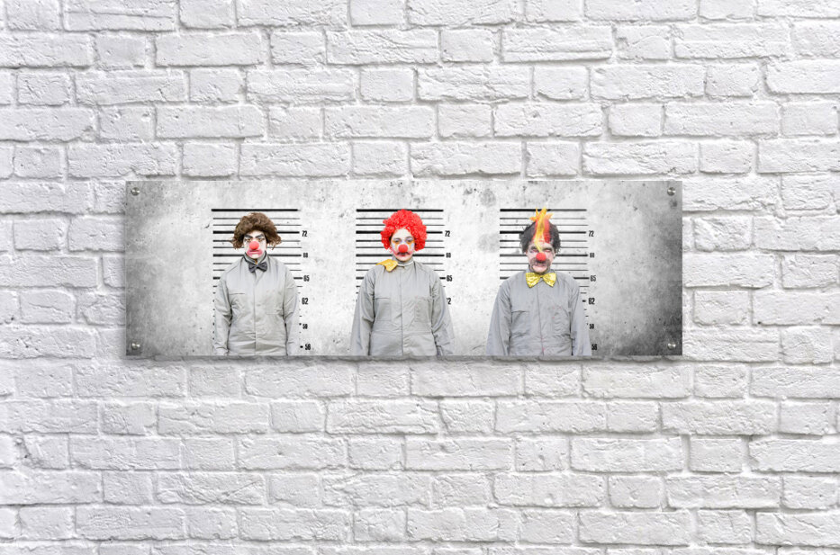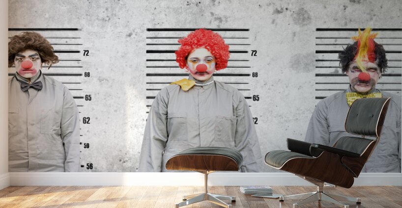A Male And Two Female Clowns Who Face Criminal Charges Lineup Against A Cement Wall In An Attempt To Find Out The Criminal Amongst The Thugs In A Line Up Of The Usual Suspects
