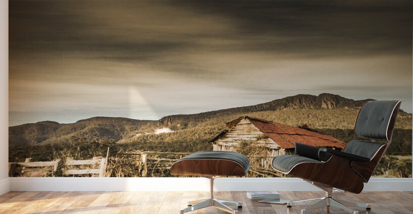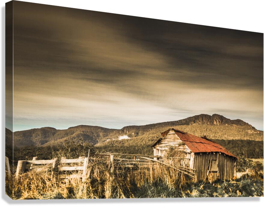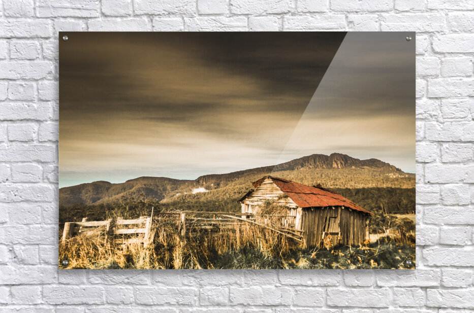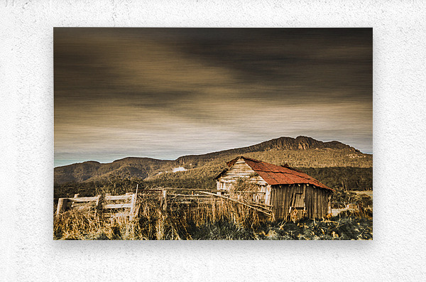 Horizontal outback landscape on a rustic rural wooden barn in state of disrepair. Liffey Tasmania Australia