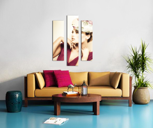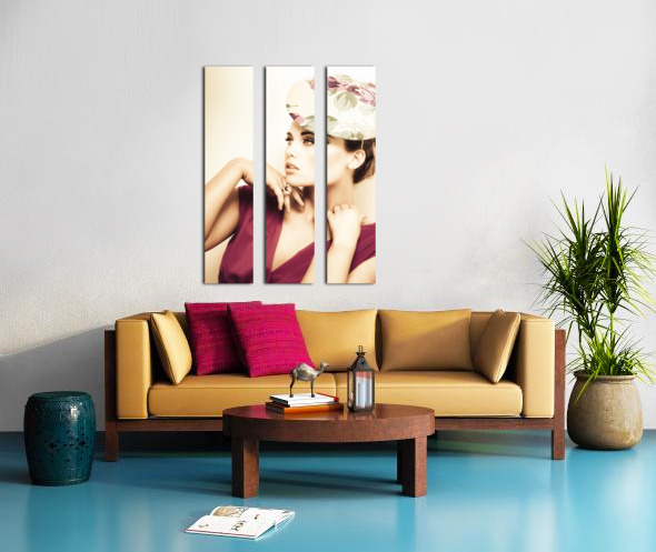 woman wearing v-neck blouse and floral hat Frame print