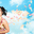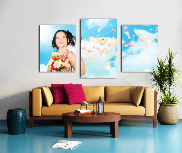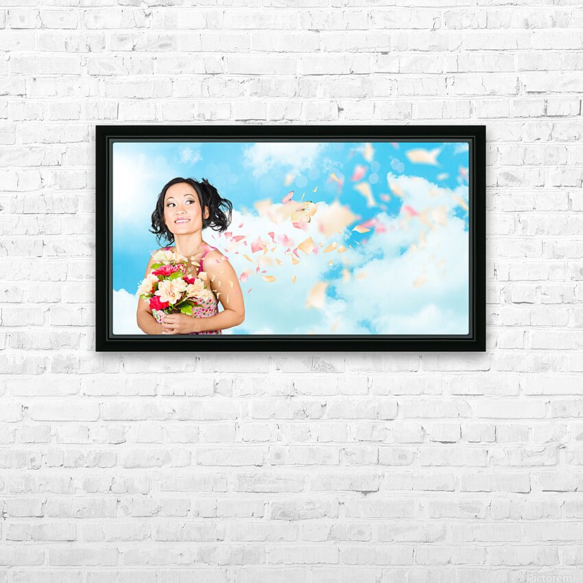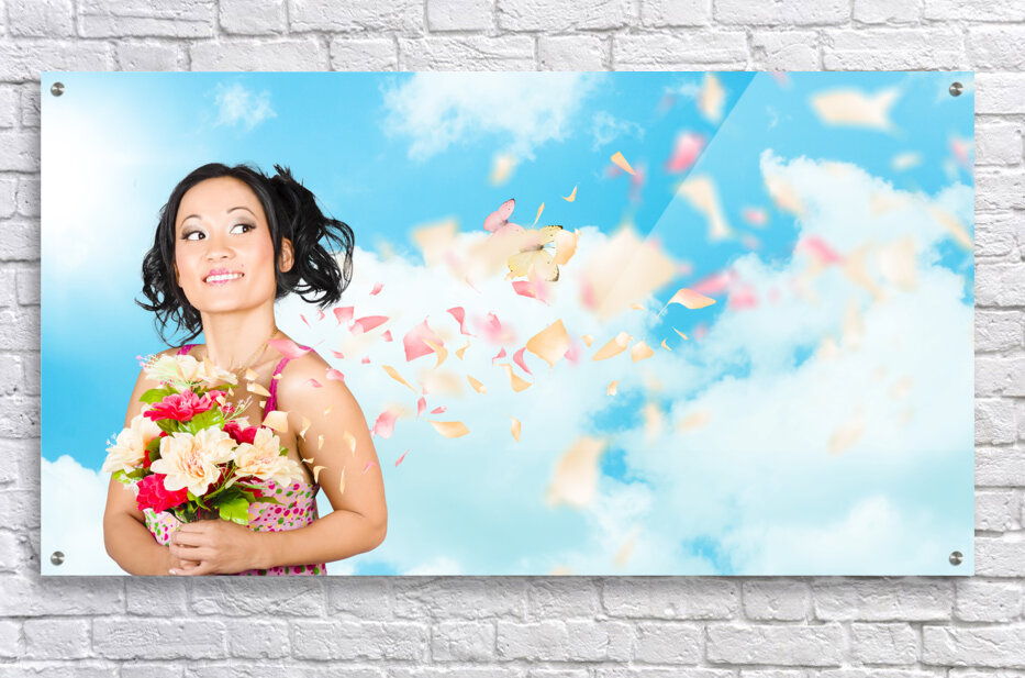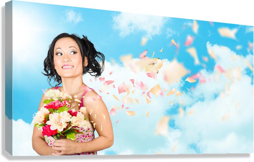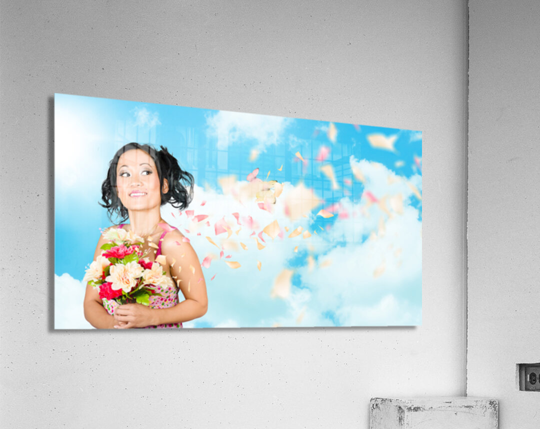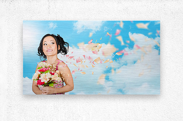 Dreamy panoramic scene on a beautiful woman holding spring bouquet flowers in the airs of a soft petal dispersion