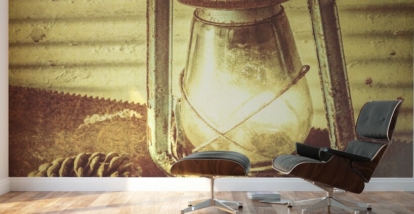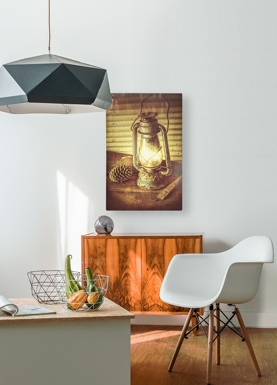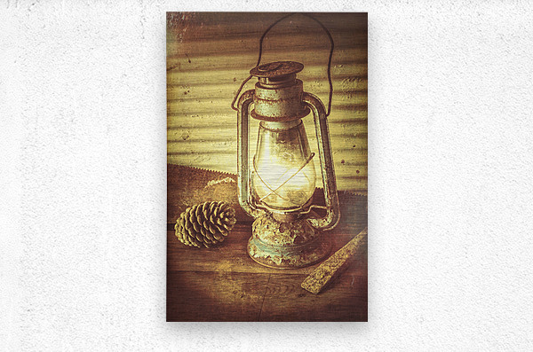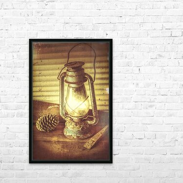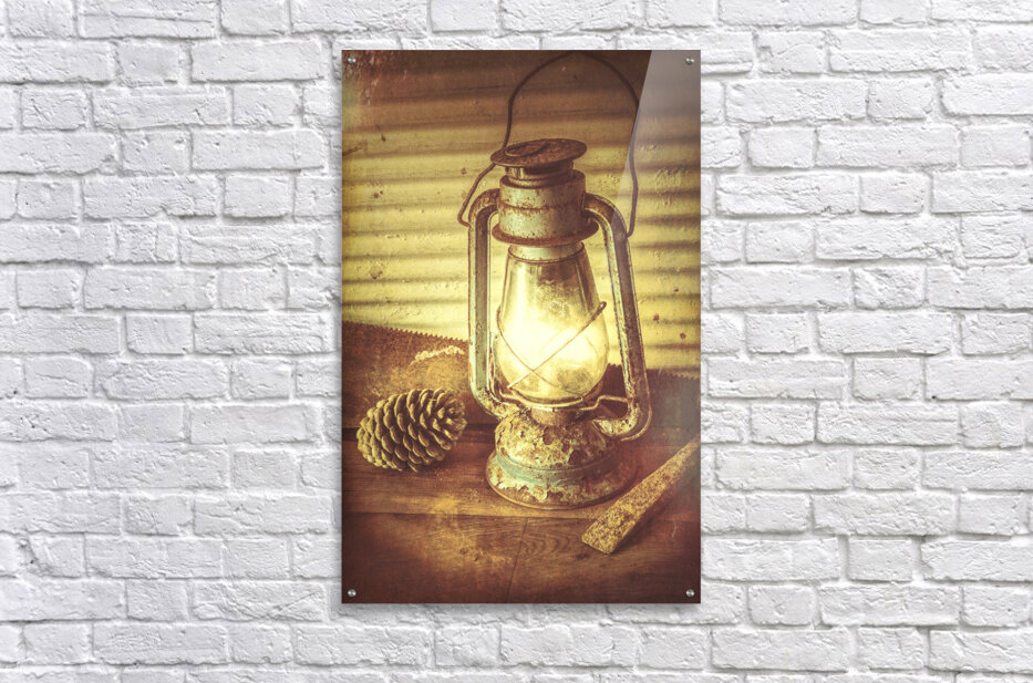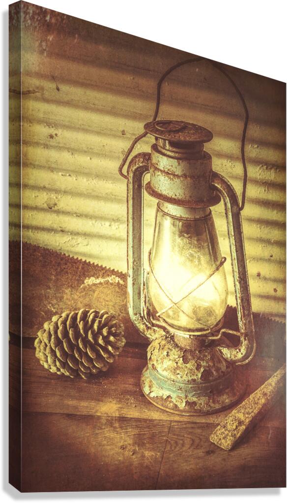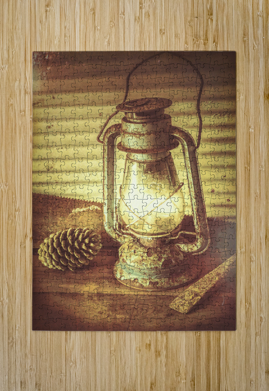 Old colonial style fine art photograph on a oil lamp burning at night next to early settler objects