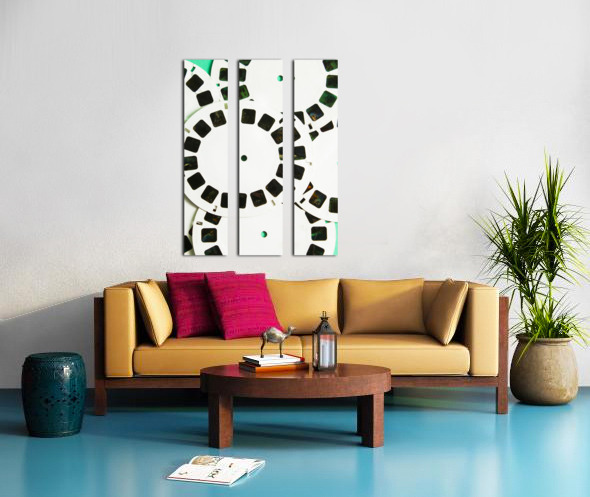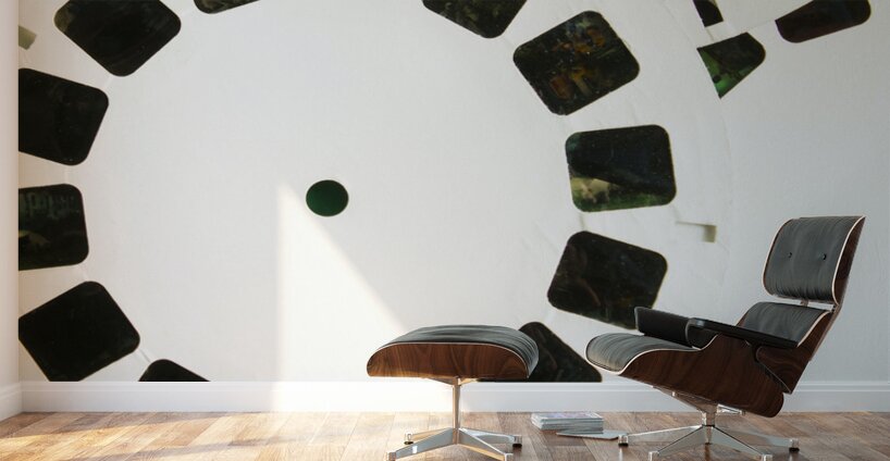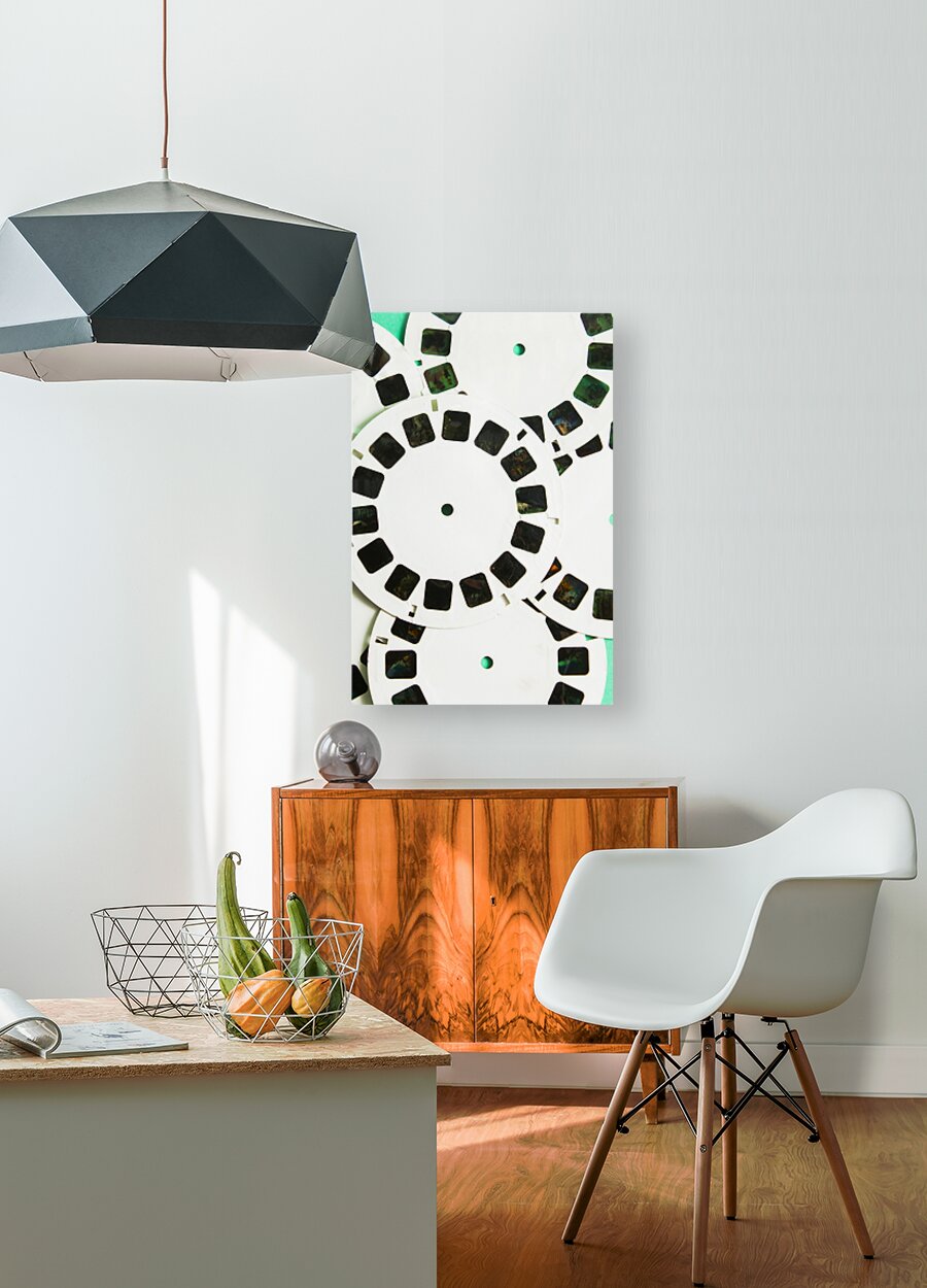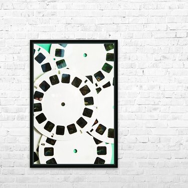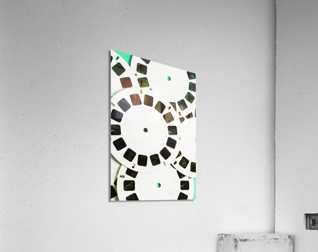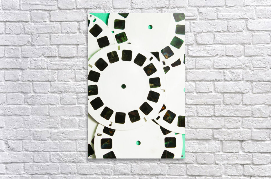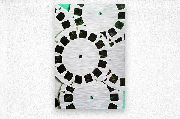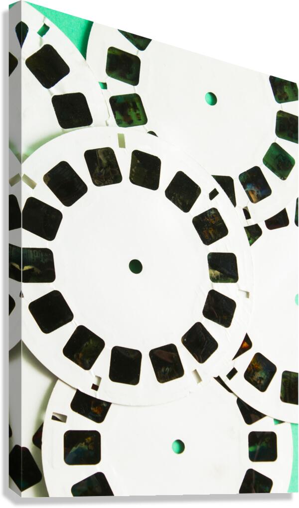 Retro 70s 80s toy slide show fun with circular view master disk slides on aqua background. 80s kids will remember