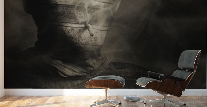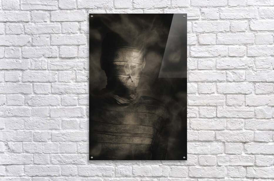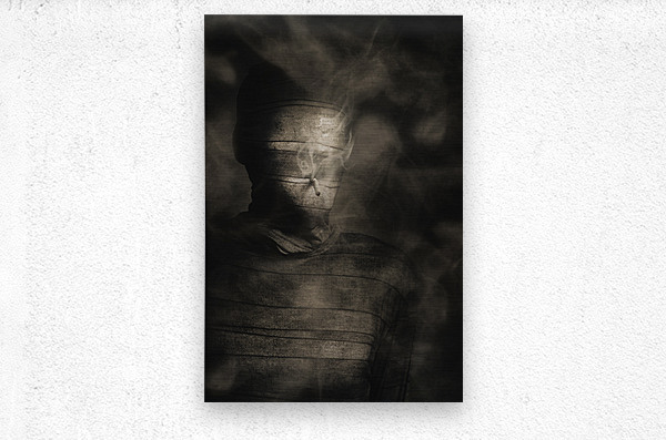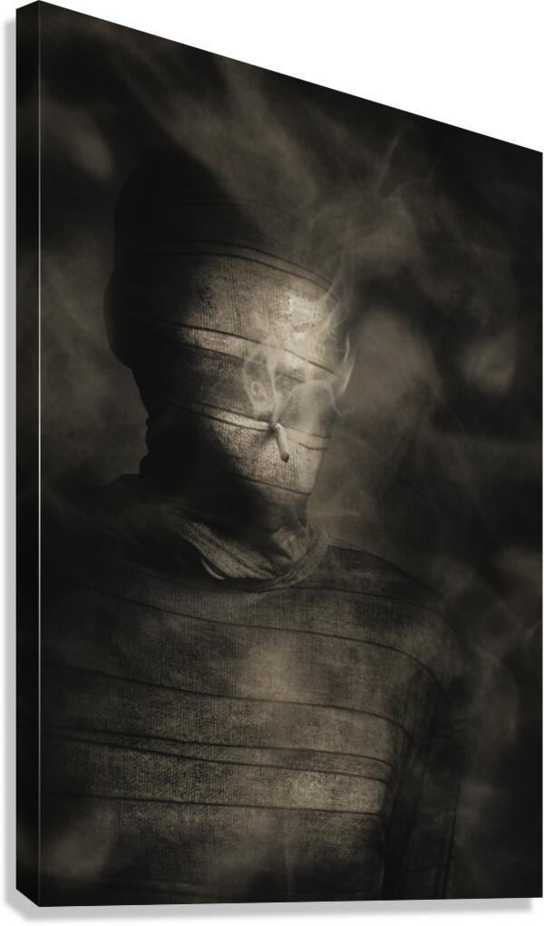 Vintage fine art photo of a mummified egyptian monster with cigarette in mouth. Rollie the smoking mummy