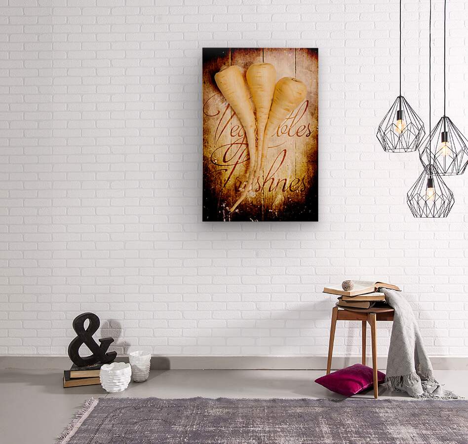 Concept art on three parsnip vegetables on wooden background with text Vegetables Freshness. Rustic farm kitchen tin sign