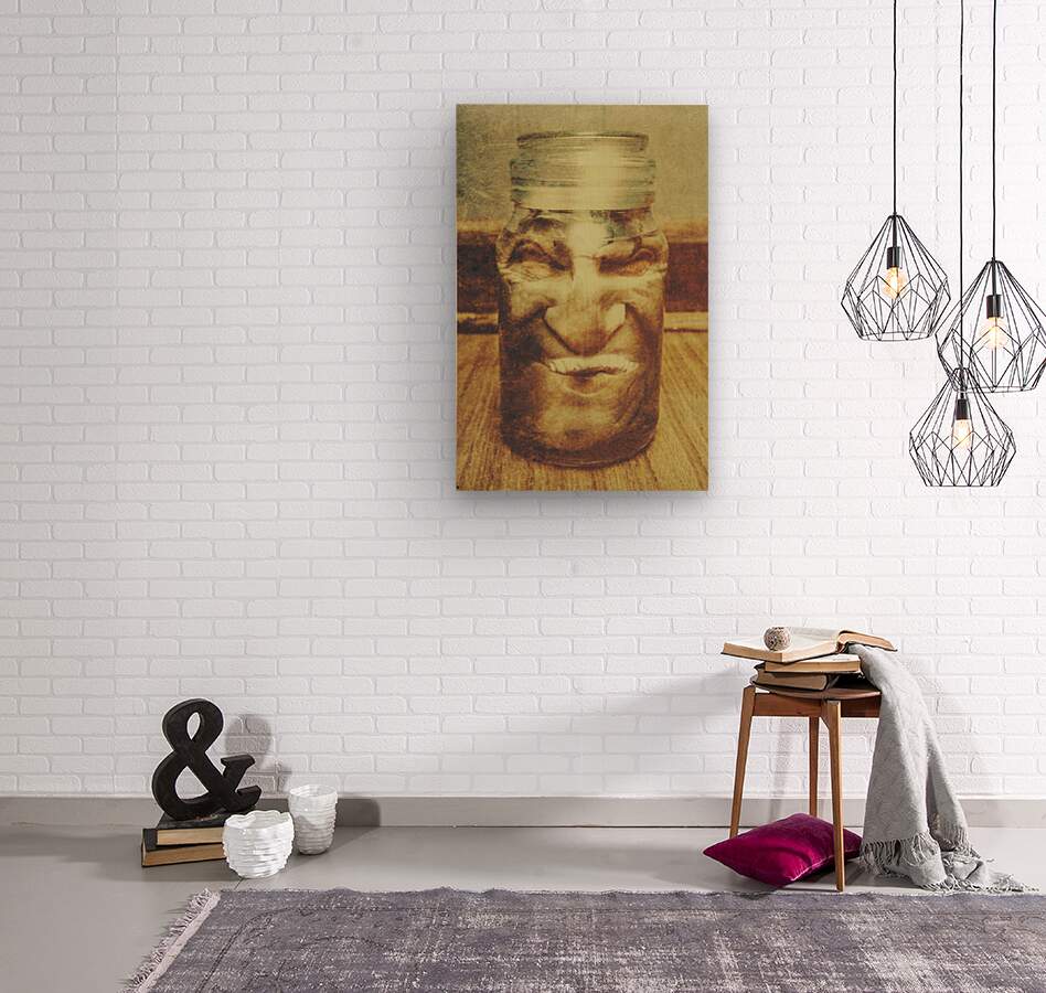 Sinister vintage halloween still life photo on the head of a monster stuck inside the a grunge jar. Spooky grainy decorations