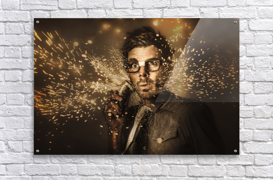 Funny mens personal grooming concept on the face of a fashion man having a shave with electric beard trimmer in a grind of razor sharp sparks. Too har...[+]