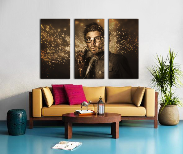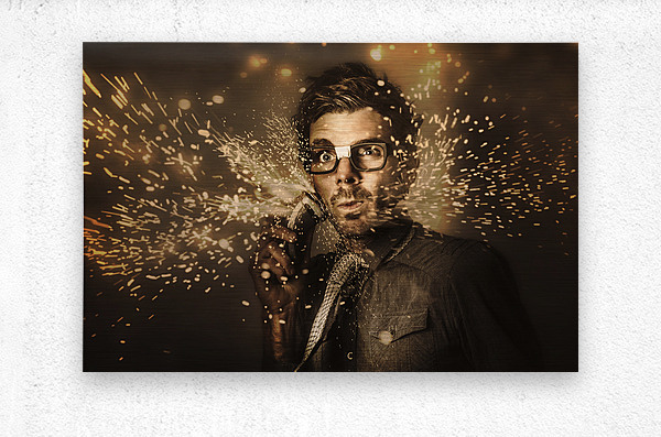 Funny mens personal grooming concept on the face of a fashion man having a shave with electric beard trimmer in a grind of razor sharp sparks. Too hard for skincare products