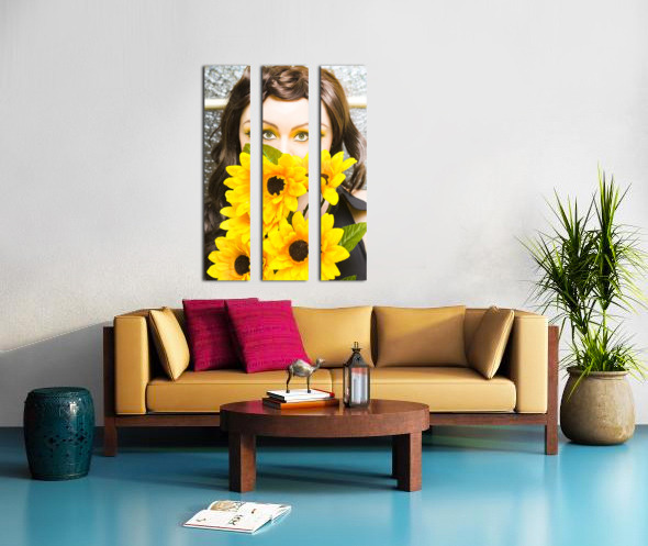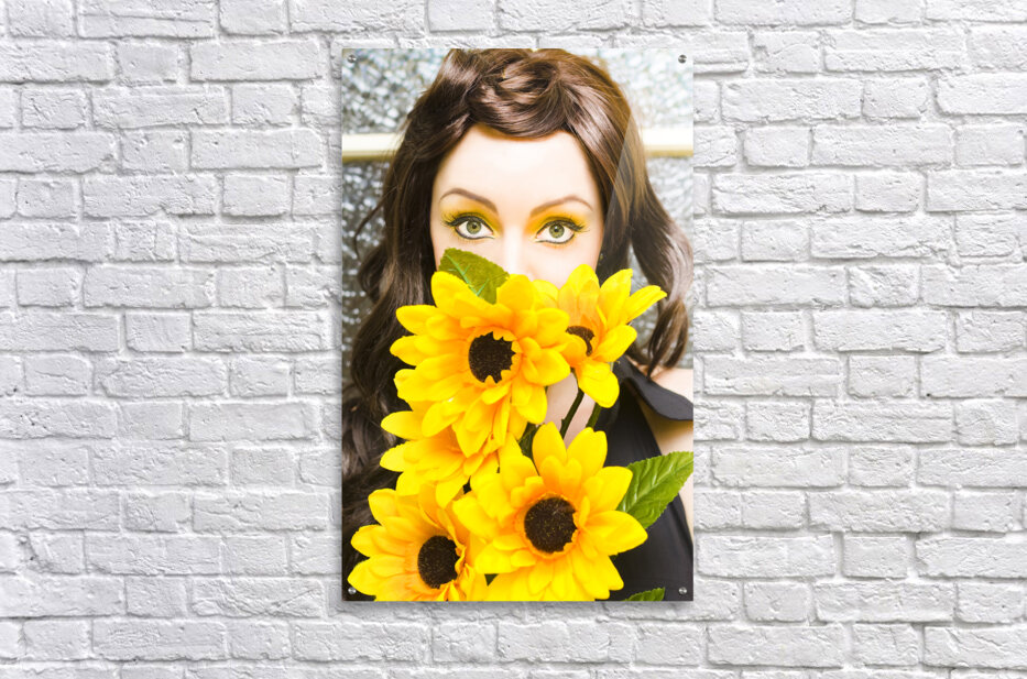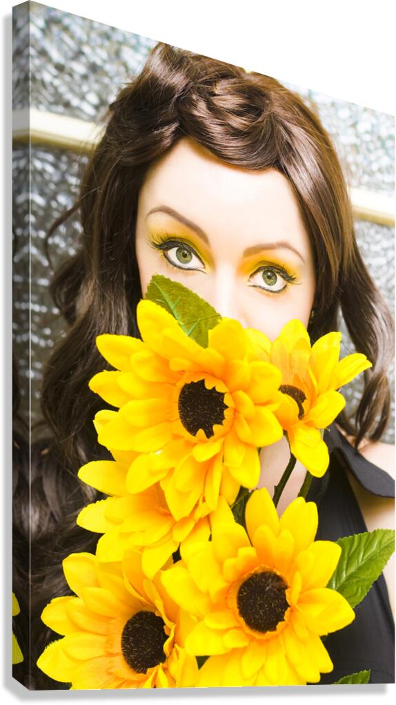 Face Of A Shy And Introverted Beautiful Young Woman With Fashionable Vibrant Yellow Make Up Hiding And Spying Behind A Vivid Bunch Of Sun Flowers