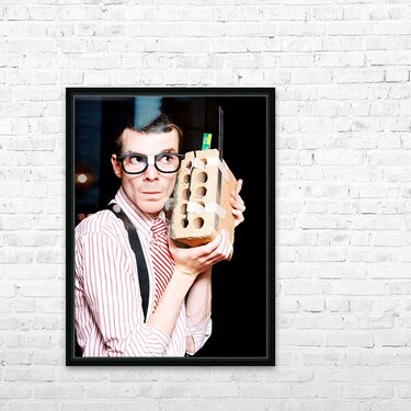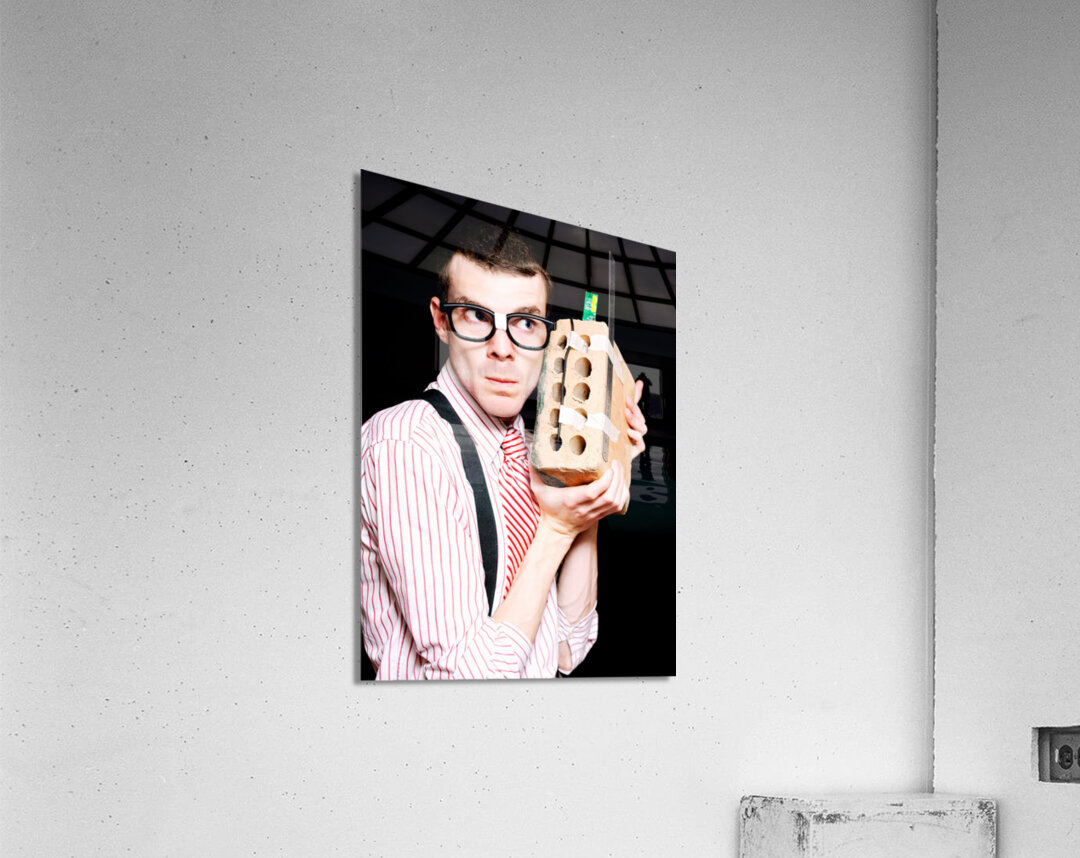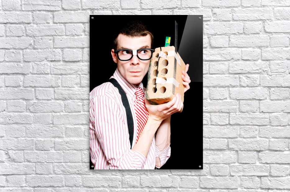 Male Nerd Inventor Holding Brick Mobile Telephone Picture Frame Printing