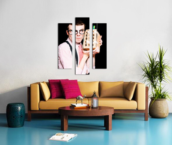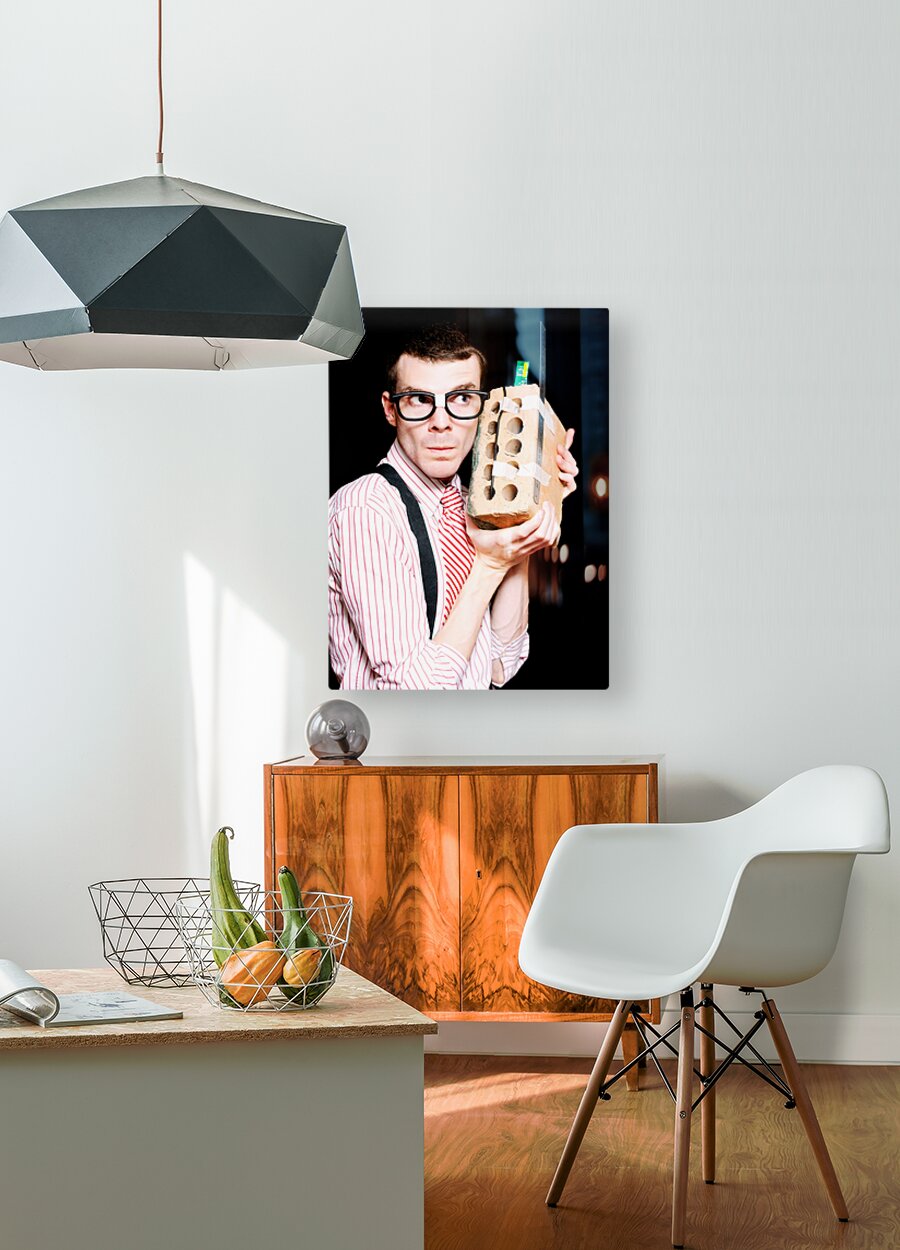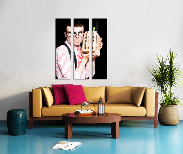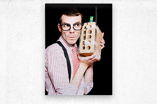 Get this artwork "Male Nerd Inventor Holding Brick Mobile Telephone" in a framed print.