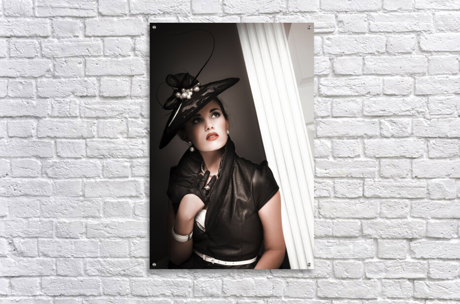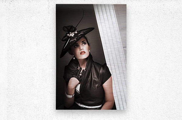 elegant woman wearing black hat with pearls black leather blouse and black half gloves leaning on a door post