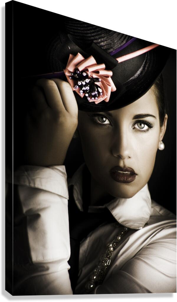 Close-up portrait on the face of a beautiful and mysterious female standing in the shadows halfway between dark and light wearing a stylish flower hat...[+]
