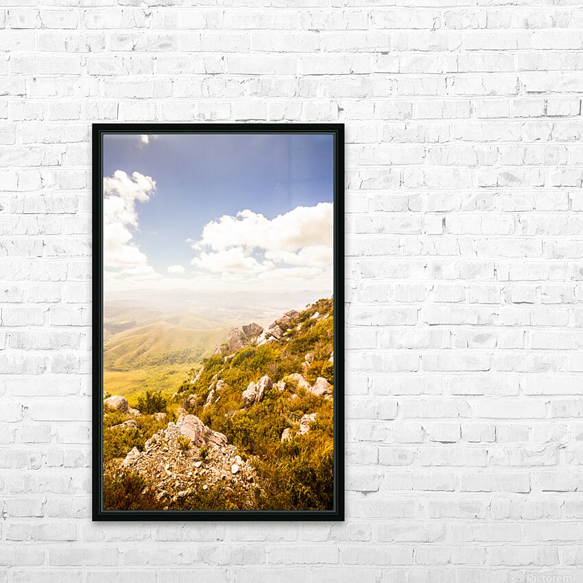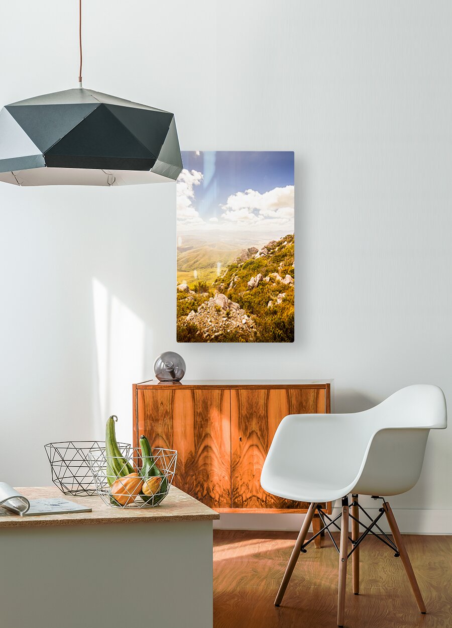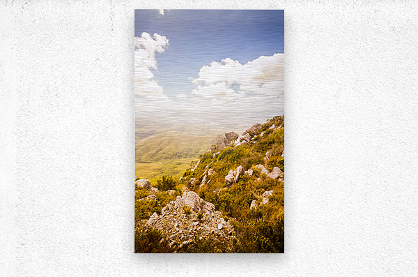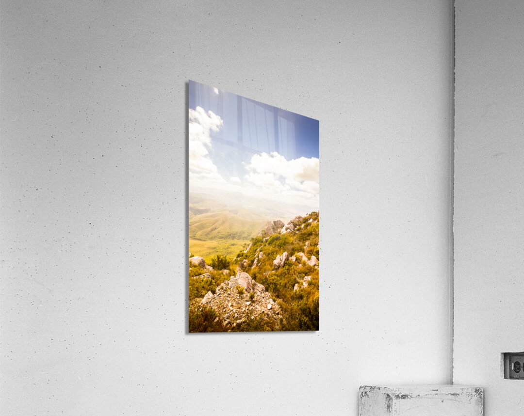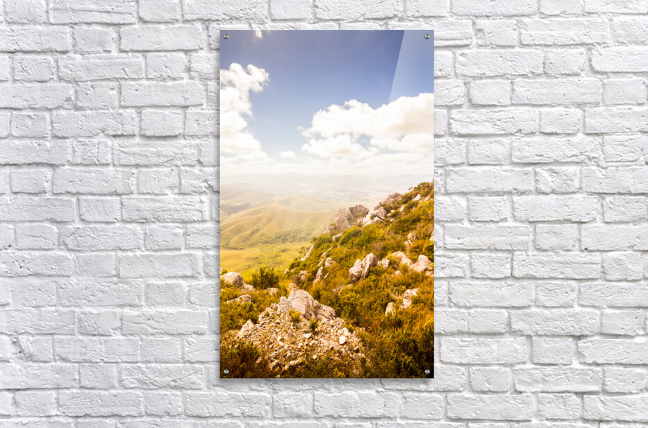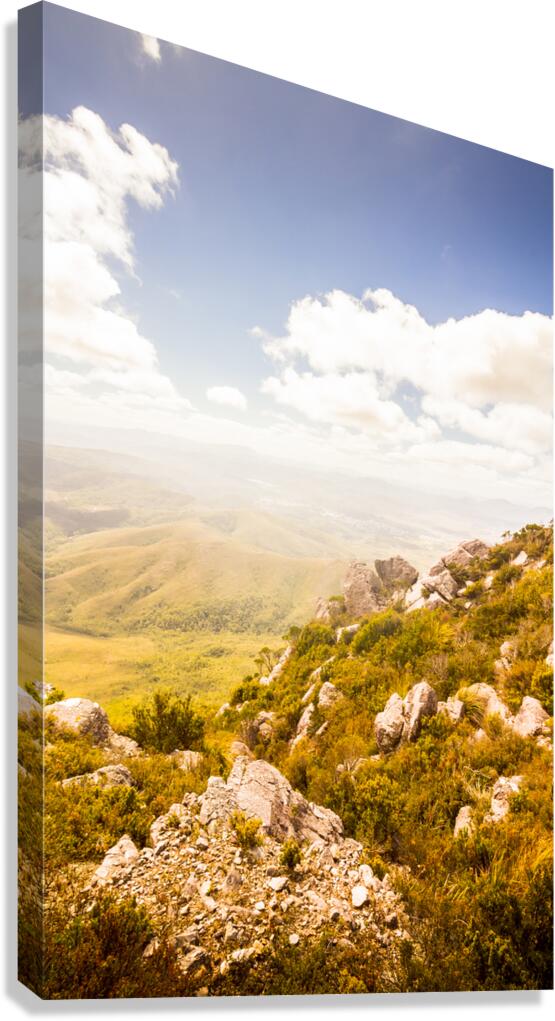 Bright landscape view on a stony elevated peak with dynamic lookout to a Western Tasmania range. Mount Zeehan Tasmania