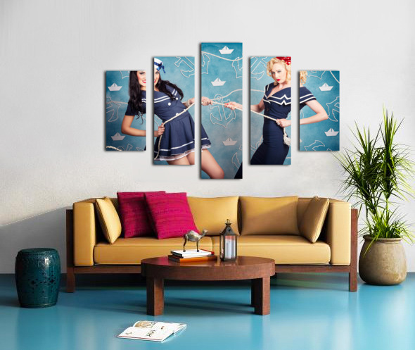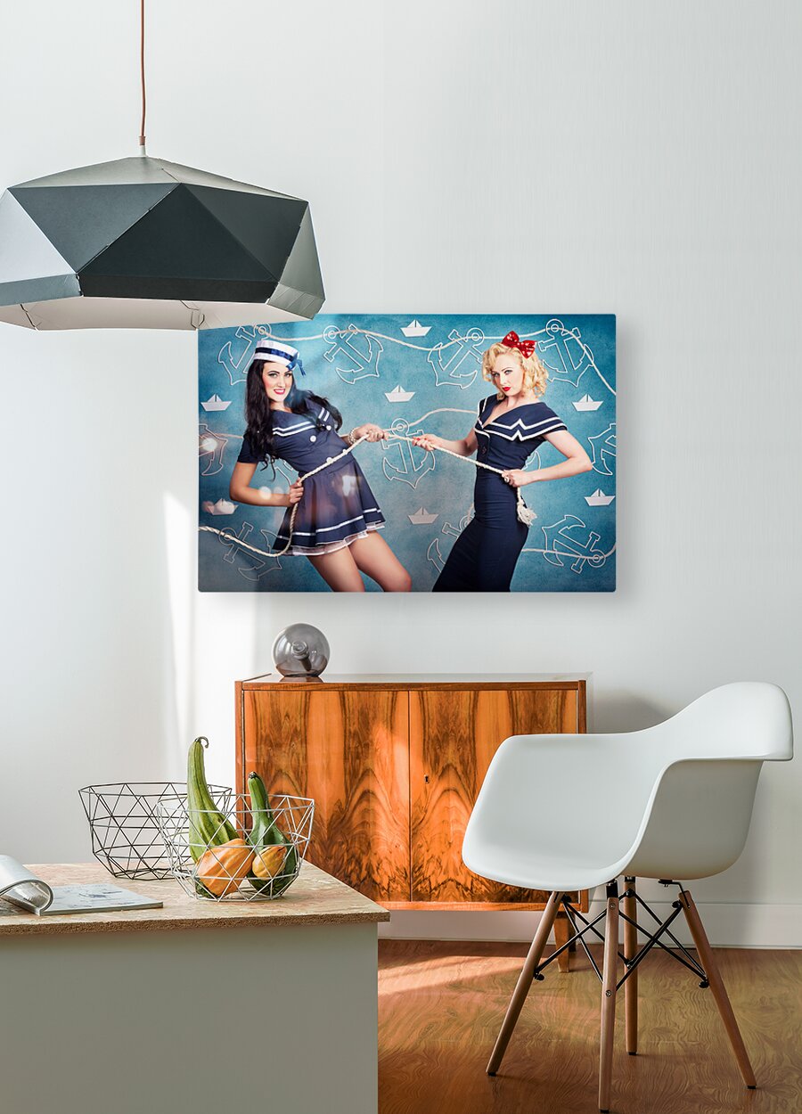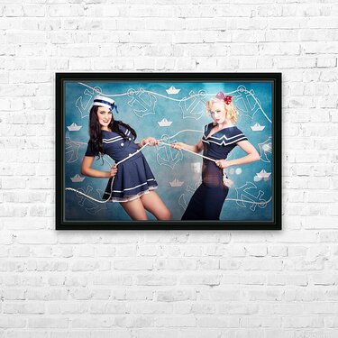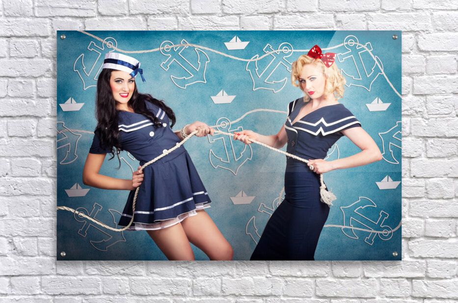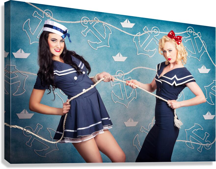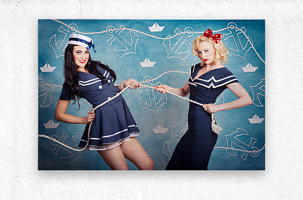 Cute retro portrait of two beautiful navy pinup girls wearing sailor uniforms pulling on a tug of war rope when personal training for elite fitness. Anchor and boat design background
