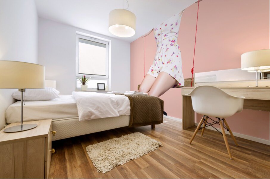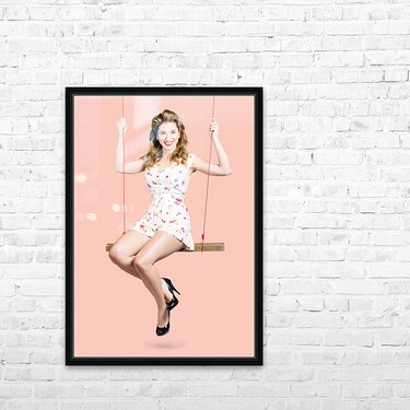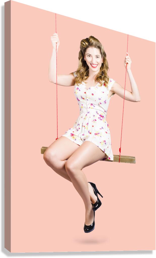 Get this artwork "Beautiful fifties pin up girl smiling on swing" in a framed print.