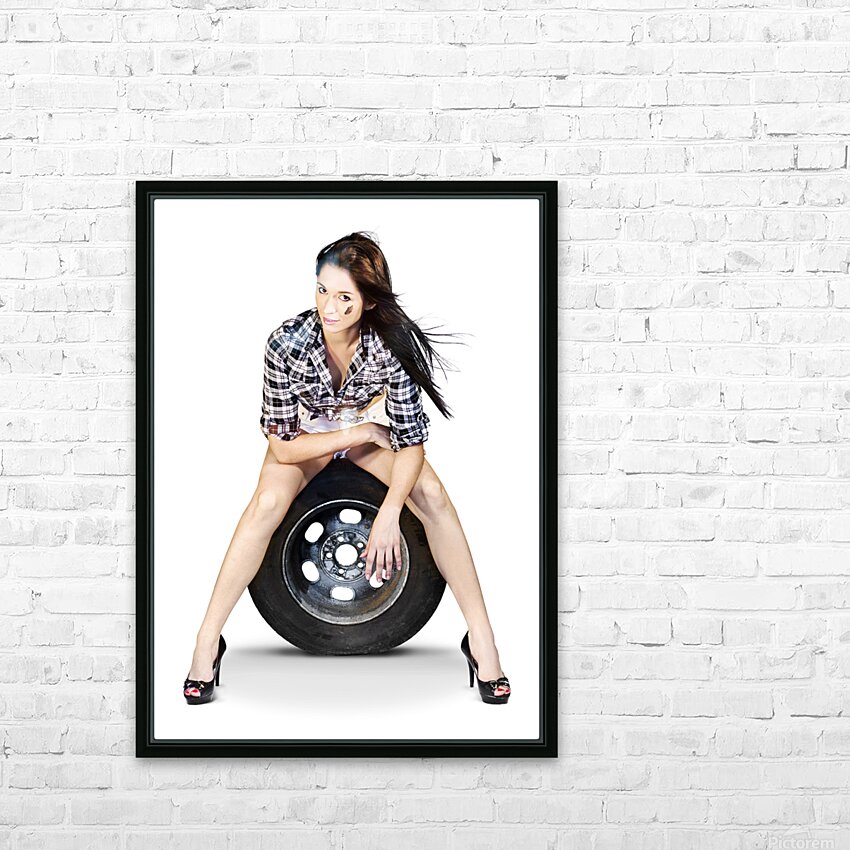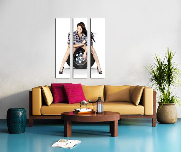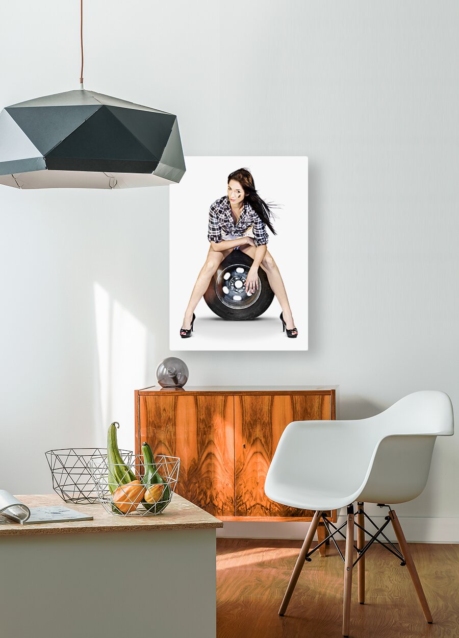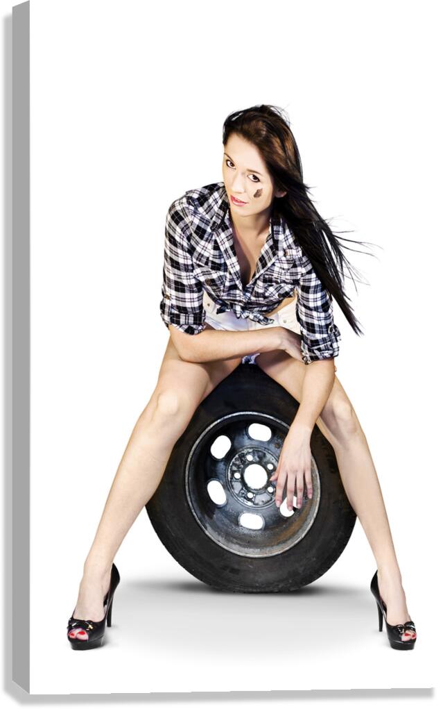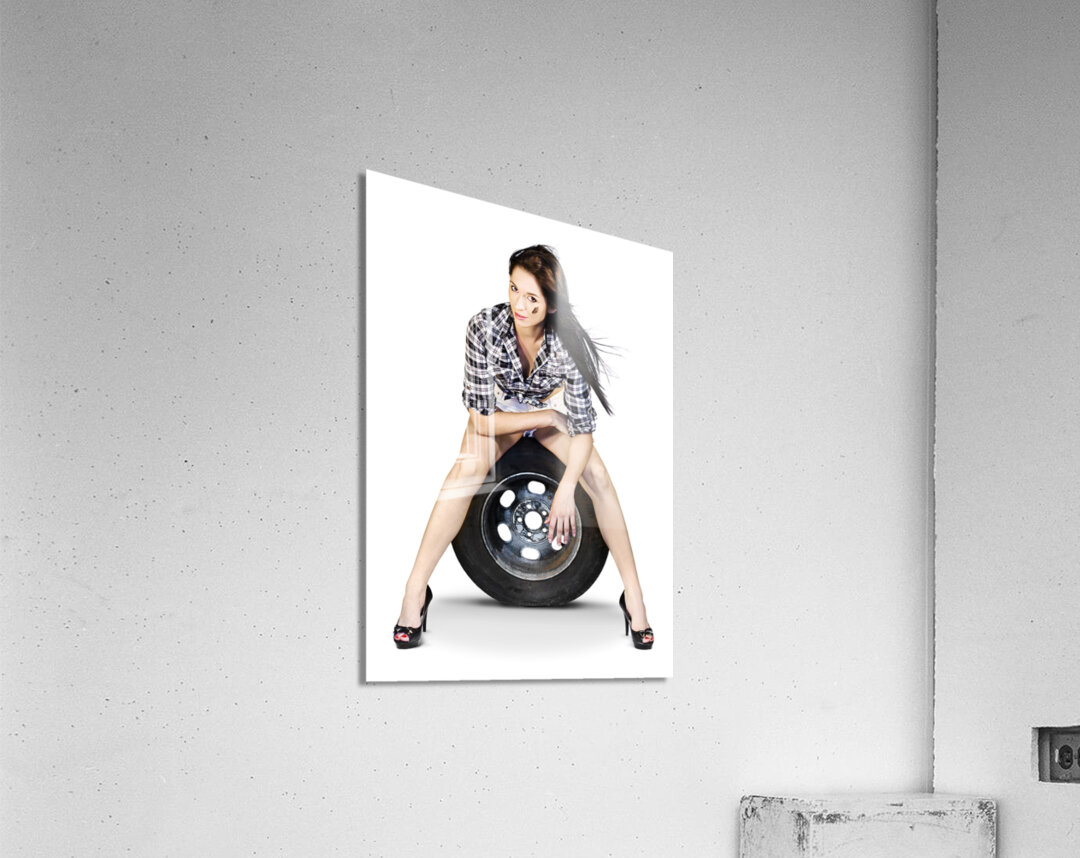 Road Trip Getaway. Sexy woman in shorts with long shapely legs sitting on a motor car tyre conceptual studio image on white.
