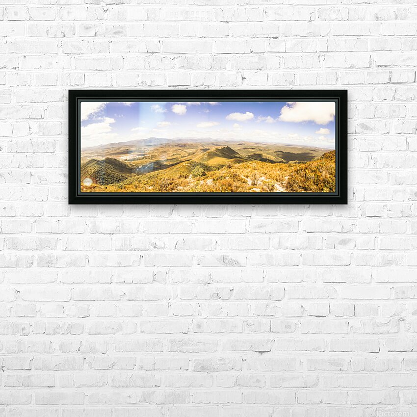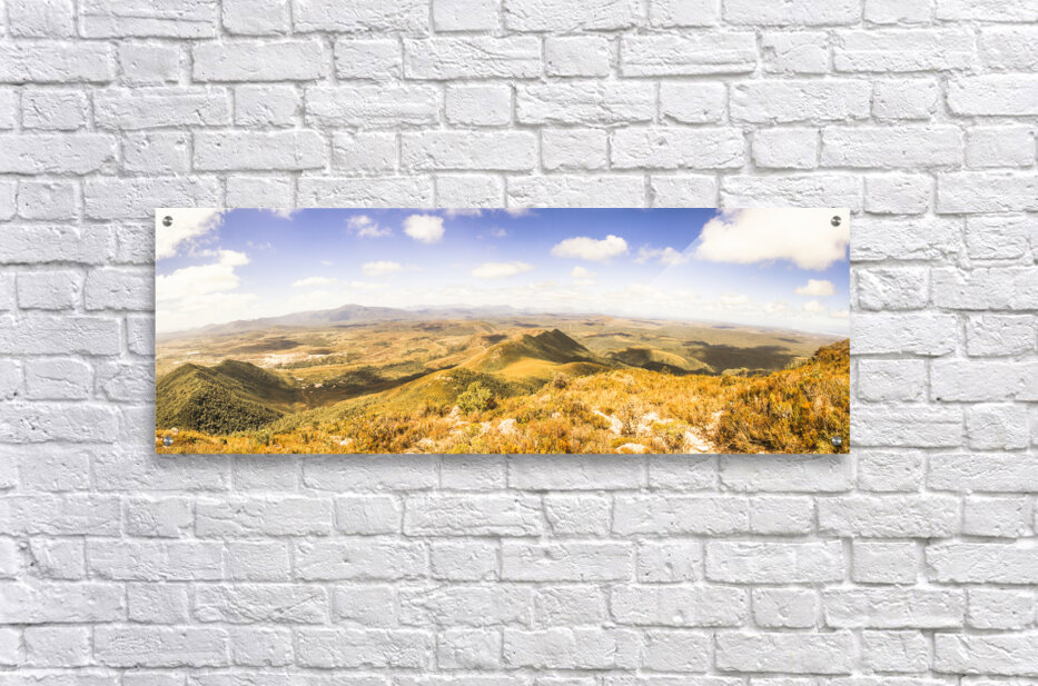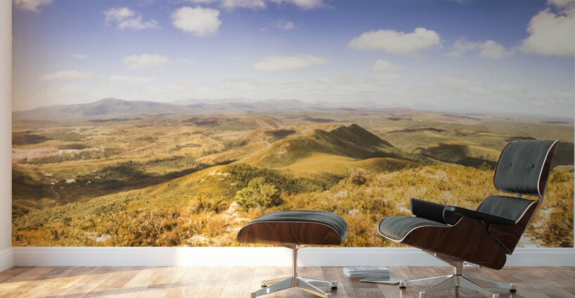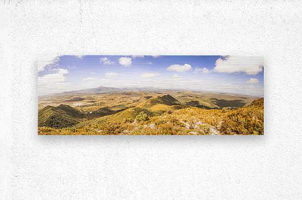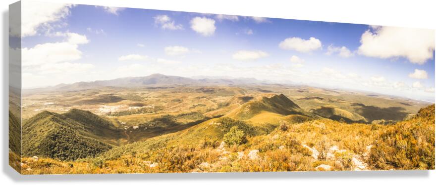Wide angle panorama of a green hilltop view looking into the valleys of magnificent western Tasmania. Taken from Mt Zeehan Australia