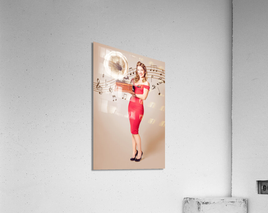 Get this artwork "Pin-up at the disco. Vintage woman with gramophone" in a framed print.