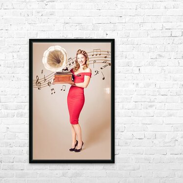 Pin-up at the disco. Vintage woman with gramophone Picture Frame Printing