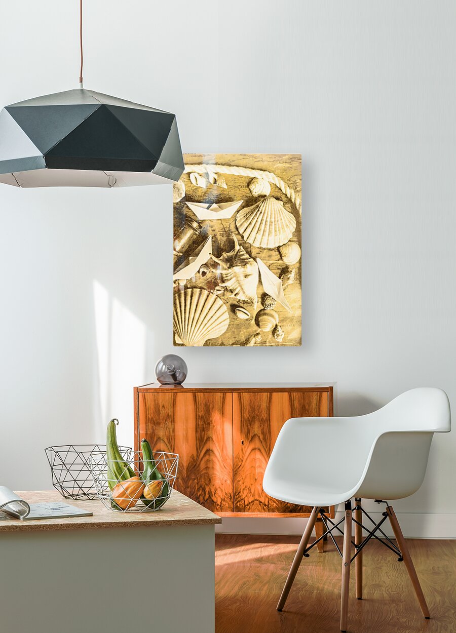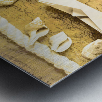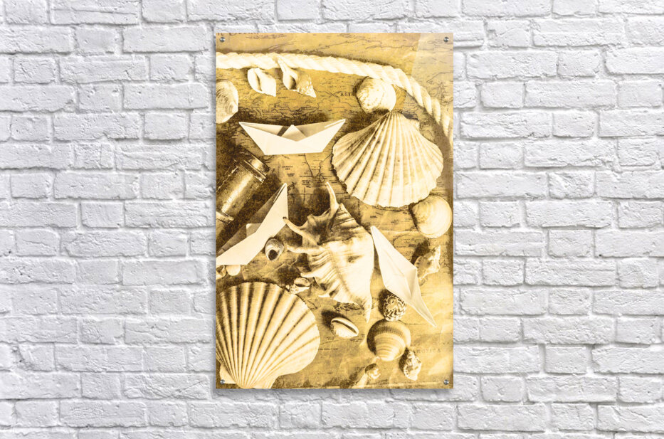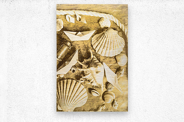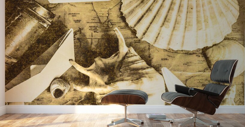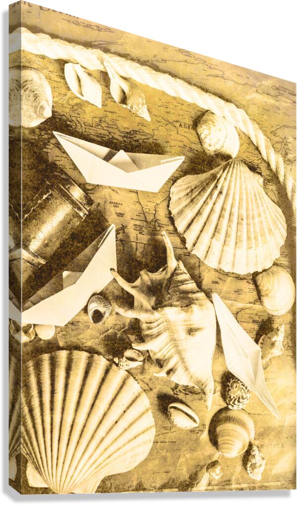 Sailing scene of old world nautics with a scattering of harbor shells on parchment maps. Tabling a cruise