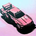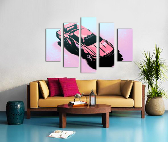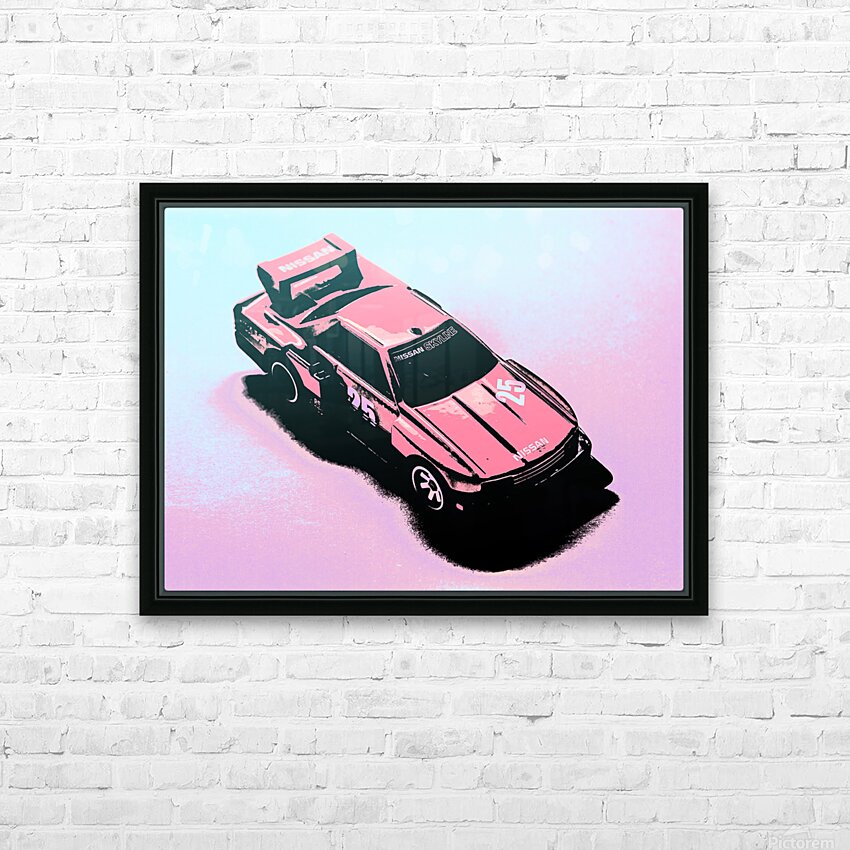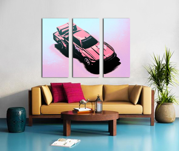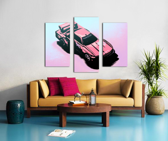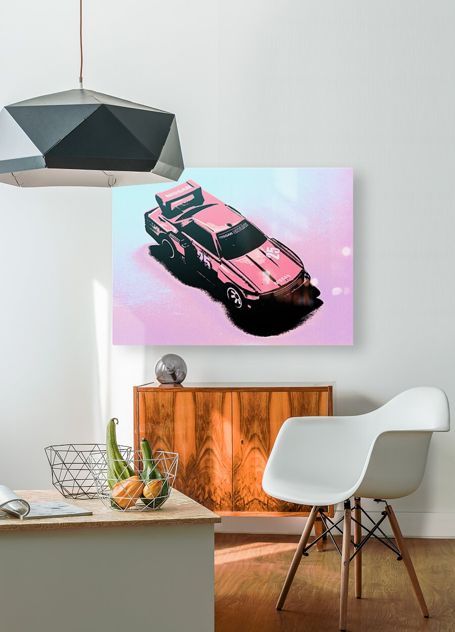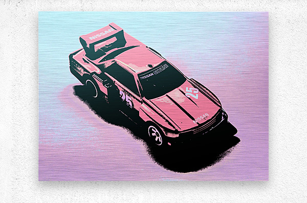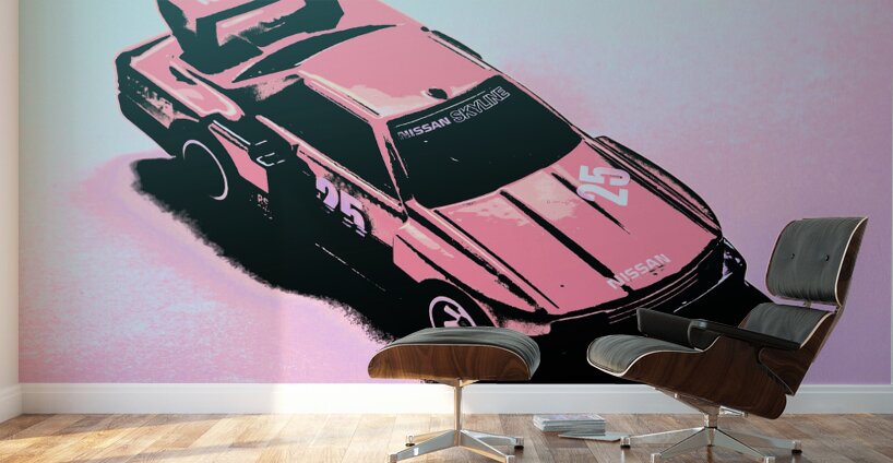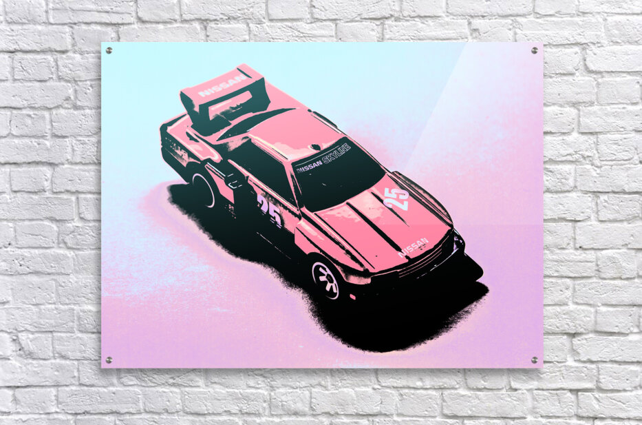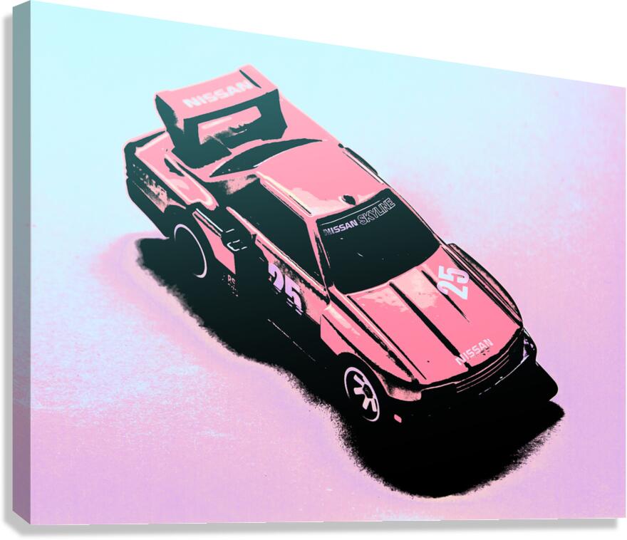 Fine art design on a miniature model Nissan Skyline car shaded in pop art pink and turquoise. Retro race colours