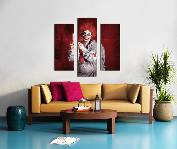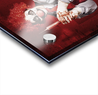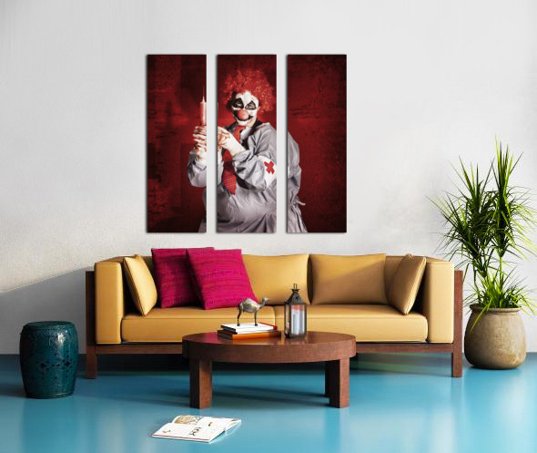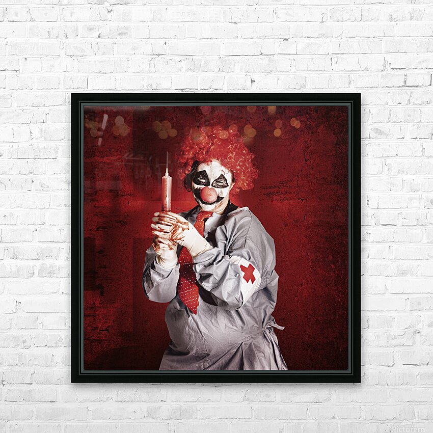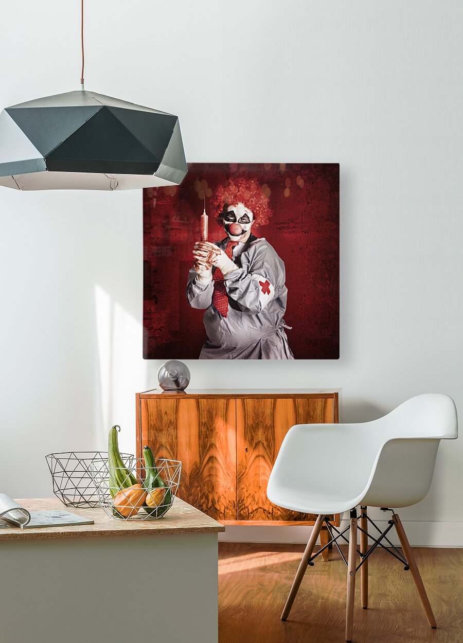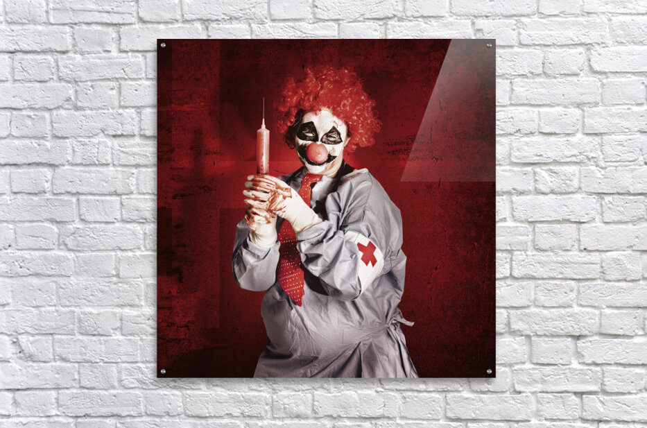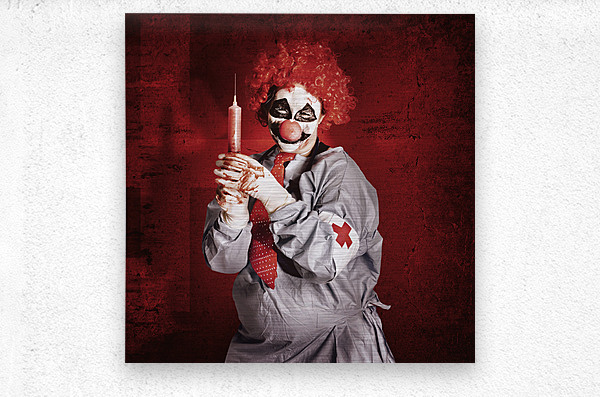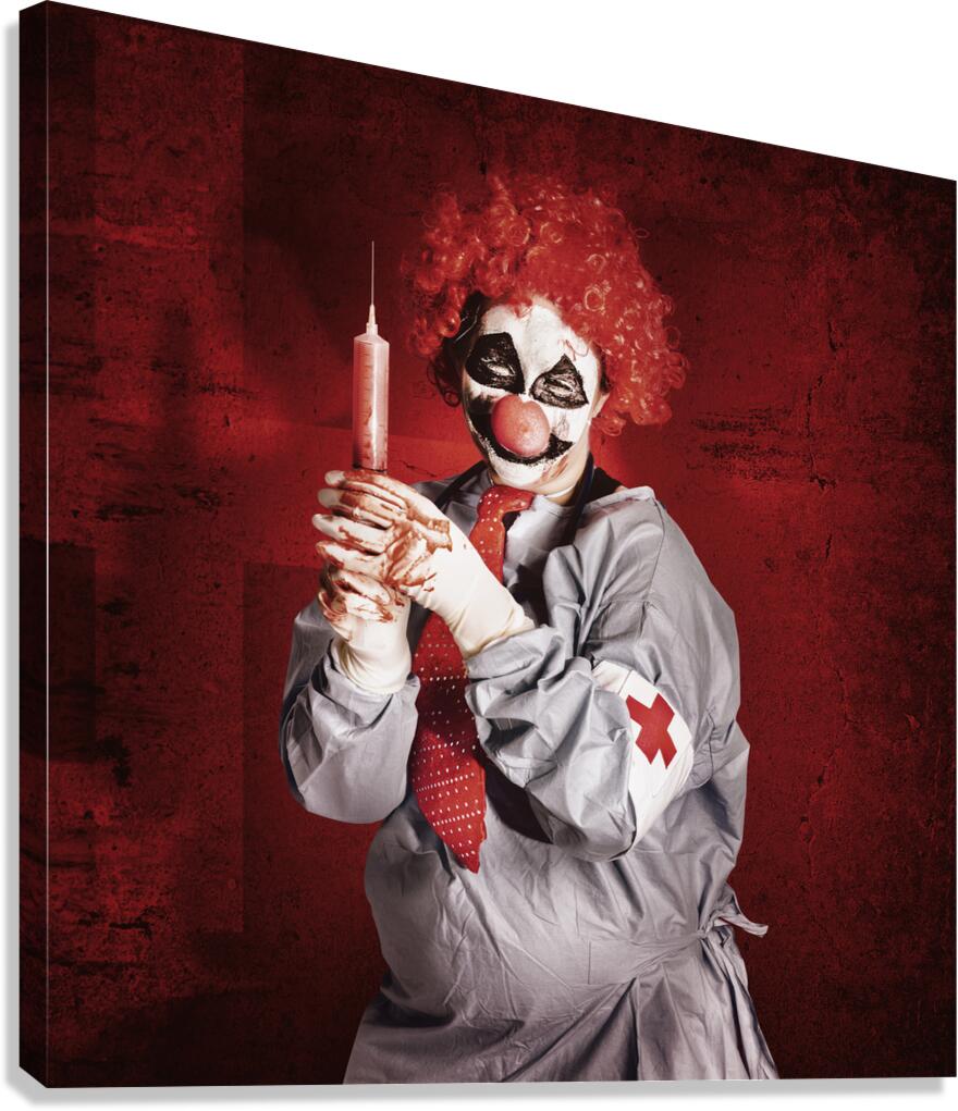 Get this artwork "Dr Death clown with big red hypodermic needle" in a framed print.