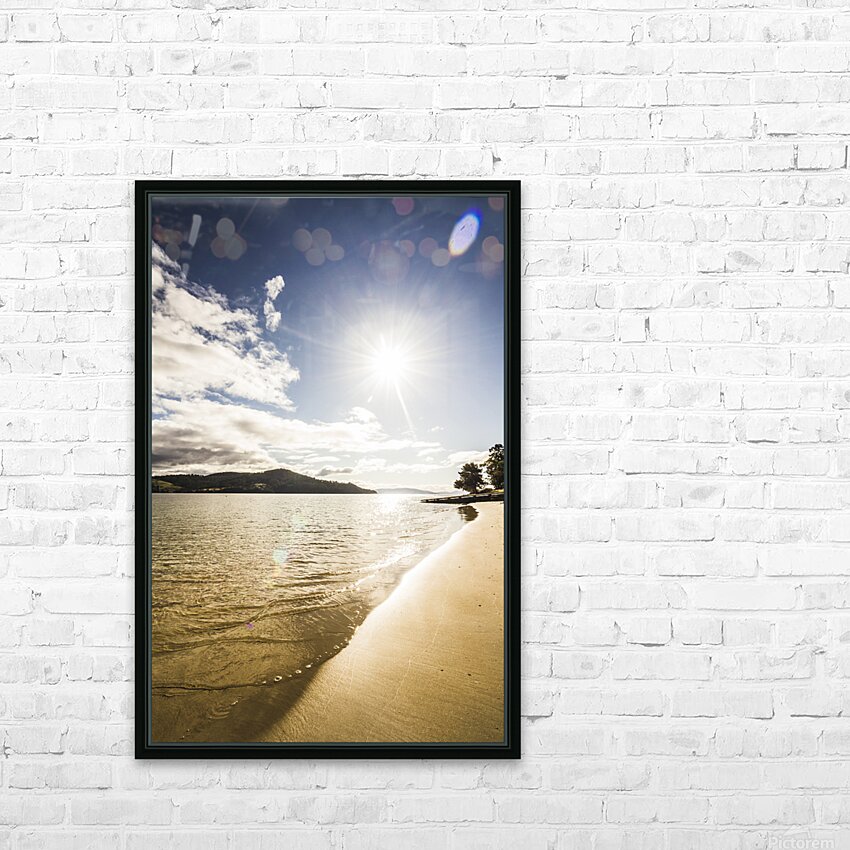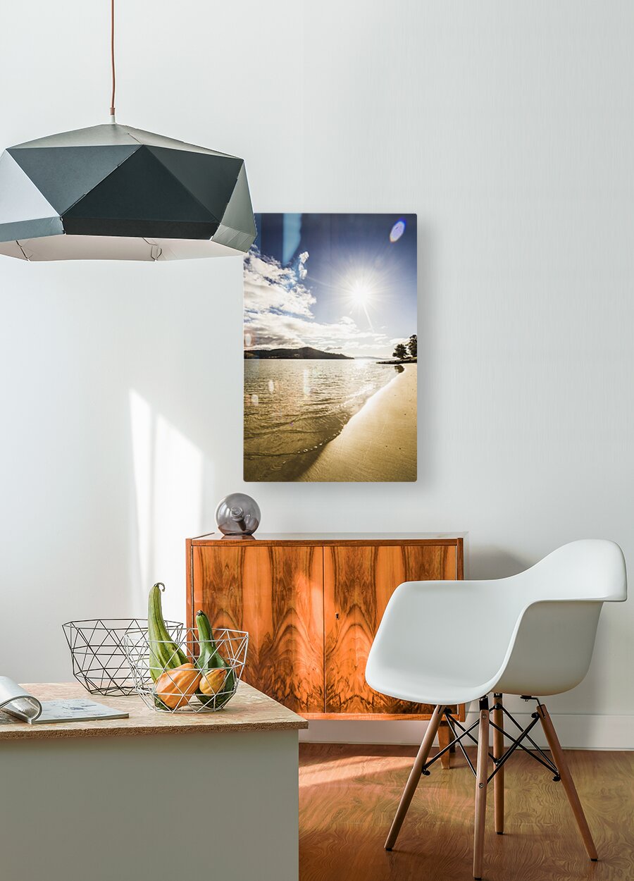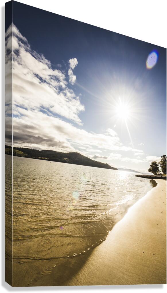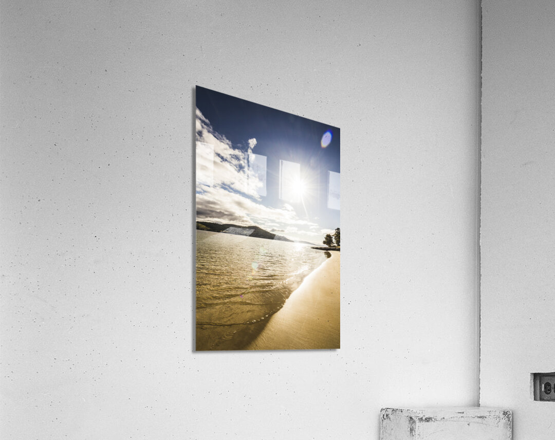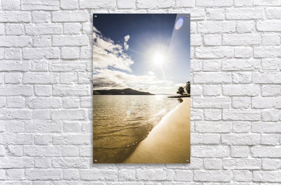Gorgeous vertical landscape of a bright beaming sun shining down on a pristine clean secluded beach. Dennes Point in north Bruny Island Tasmania Austr...[+]