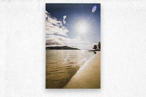 Gorgeous vertical landscape of a bright beaming sun shining down on a pristine clean secluded beach. Dennes Point in north Bruny Island Tasmania Australia