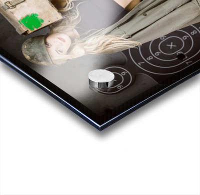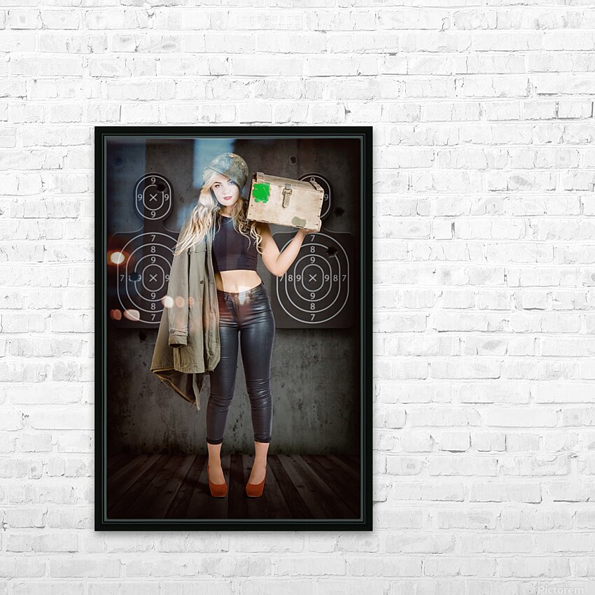 Army pinup girl at rifle range. Bullet proof Picture Frame Printing
