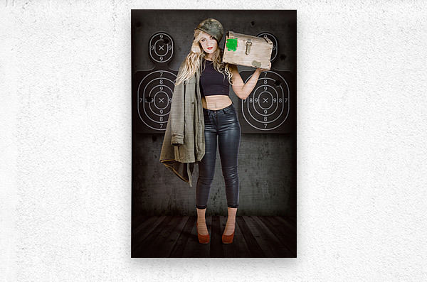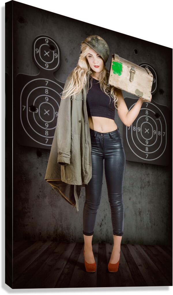 Propaganda style military portrait of a bomb shell blond army pinup girl carrying box of bullets at army shooting range with body target practice background. Bullet proof