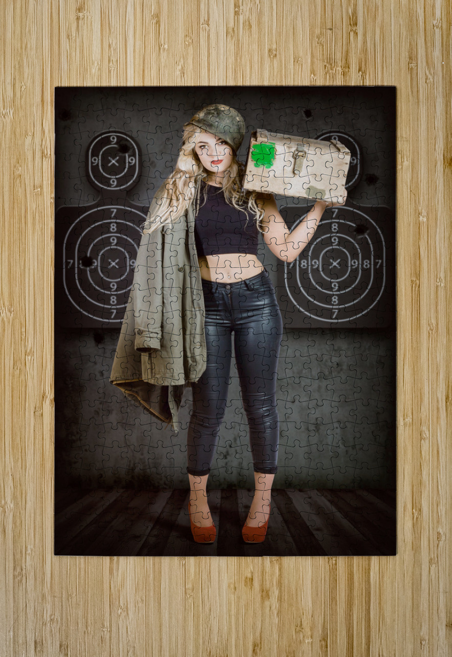 Army pinup girl at rifle range. Bullet proof Jorgo Puzzle printing