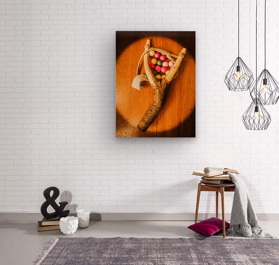 Old fashioned nostalgic still-life on a branch carved slingshot with pellets of gum ball ammunition