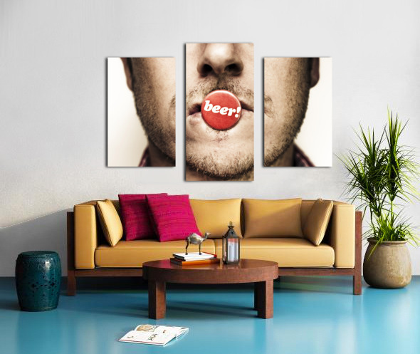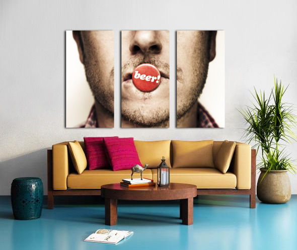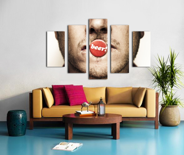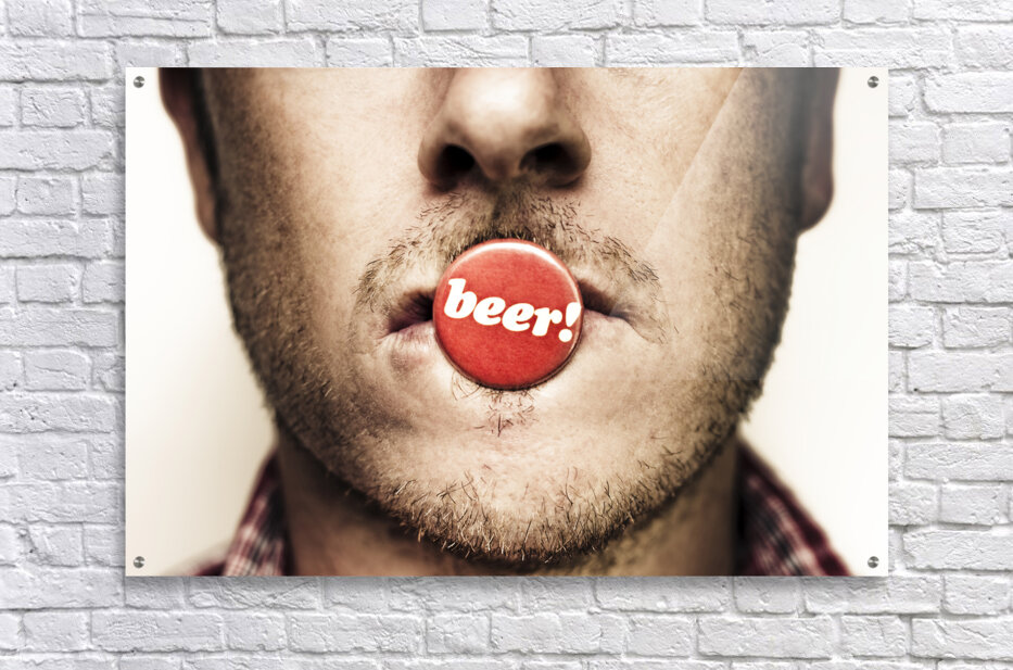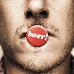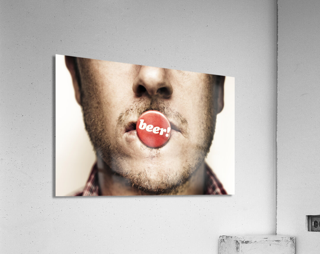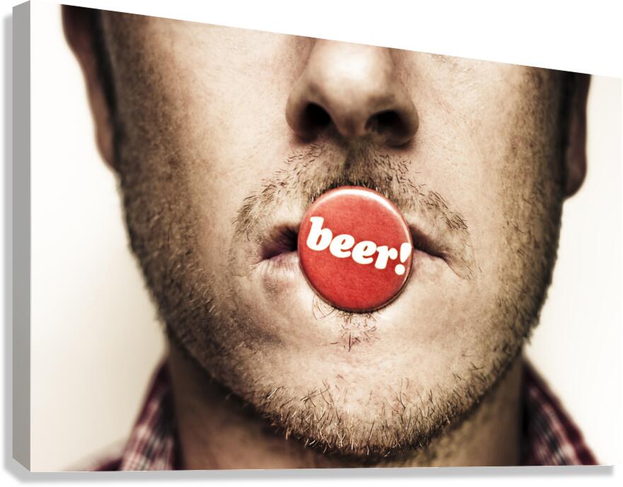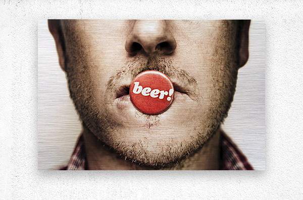 Grunge photograph on the face of a unshaven young man with a tin button or badge displaying the word Beer on his lips signalling his insatiable love of beer