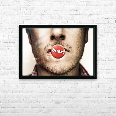 Grunge photograph on the face of a unshaven young man with a tin button or badge displaying the word Beer on his lips signalling his insatiable love o...[+]