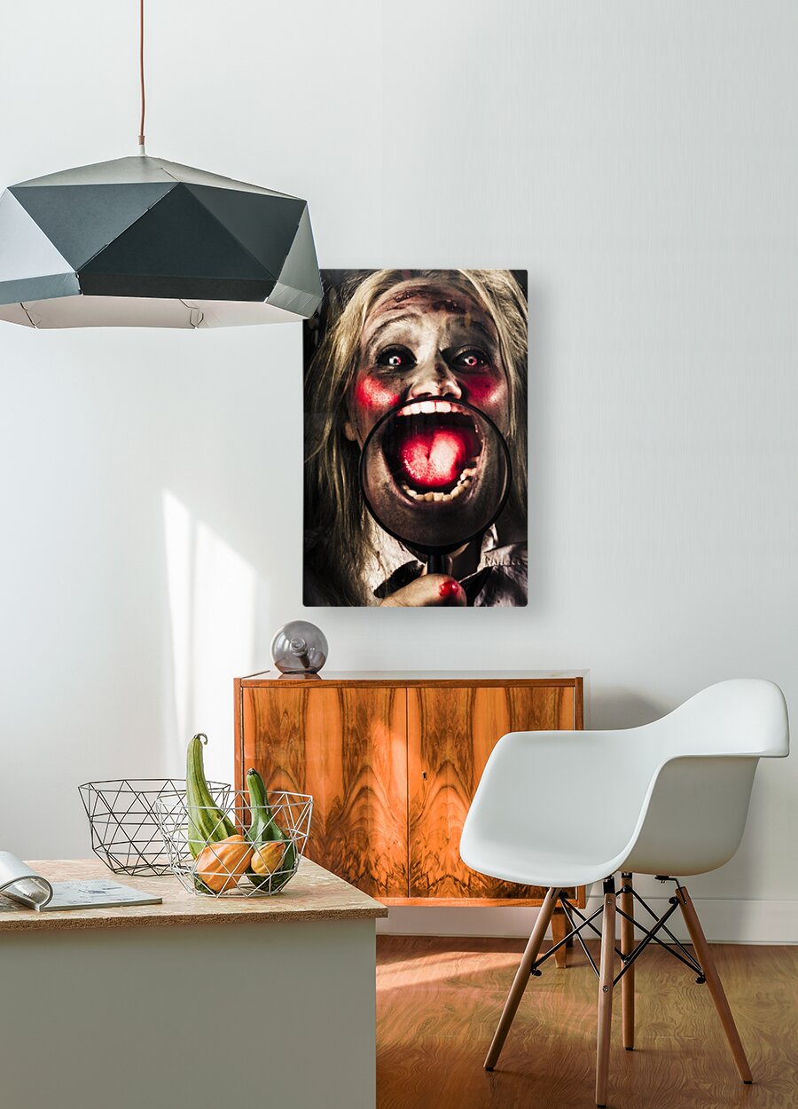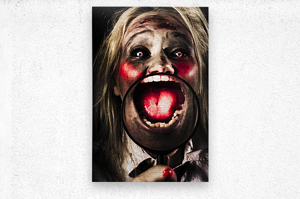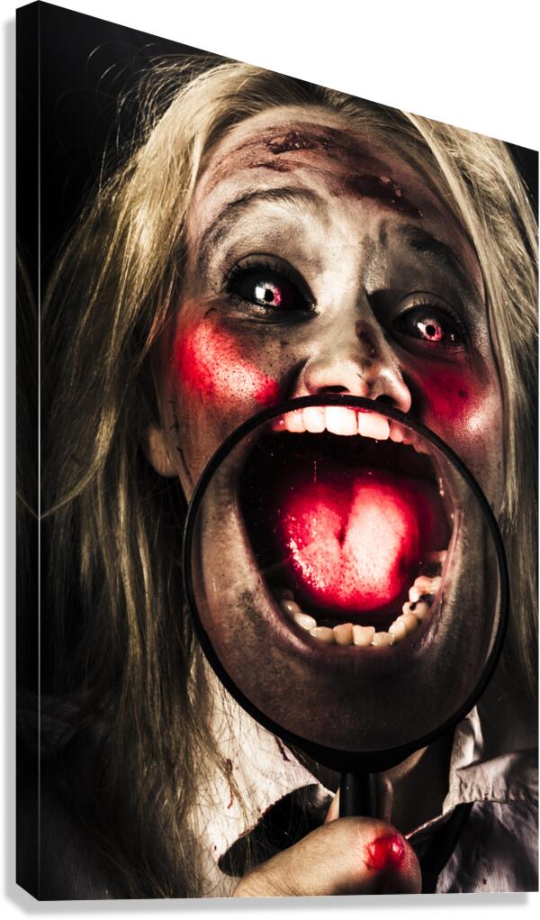 Horror portrait of a dark and scary zombie face holding magnifying glass to bloody mouth while laughing out loud with pure evilness