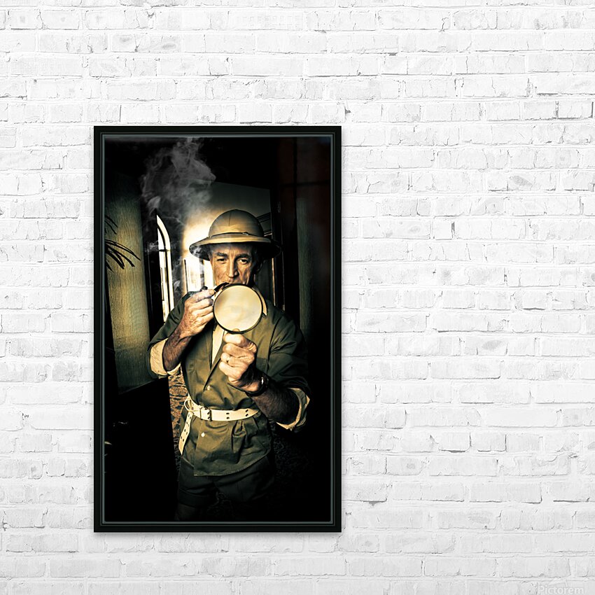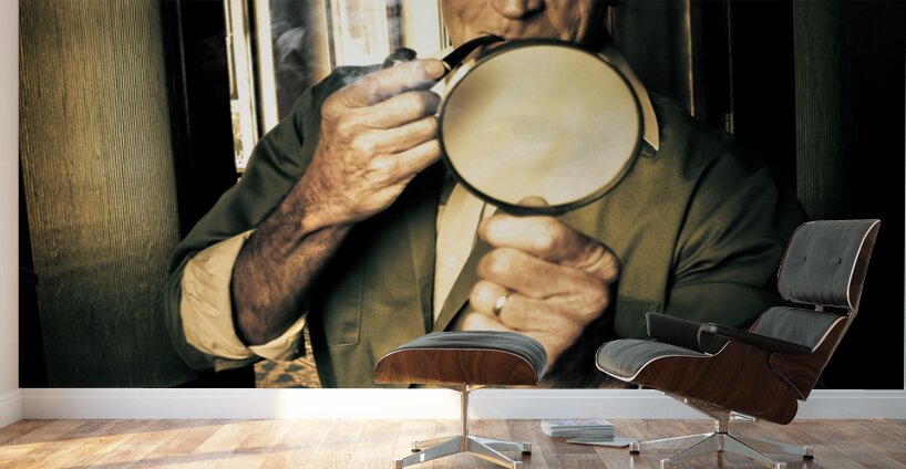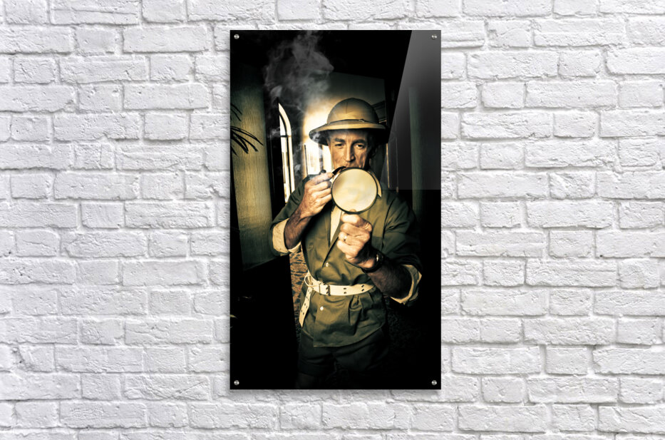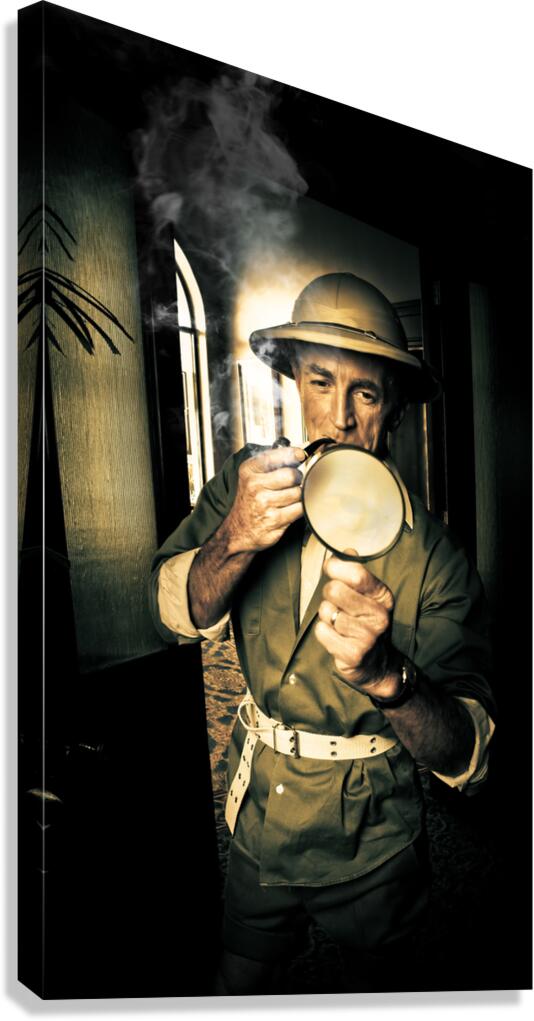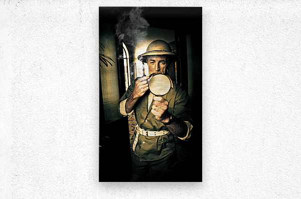 Olden day explorer in vintage clothing smoking a pipe and holding a magnifying glass walking along the halls of discovery and adventure
