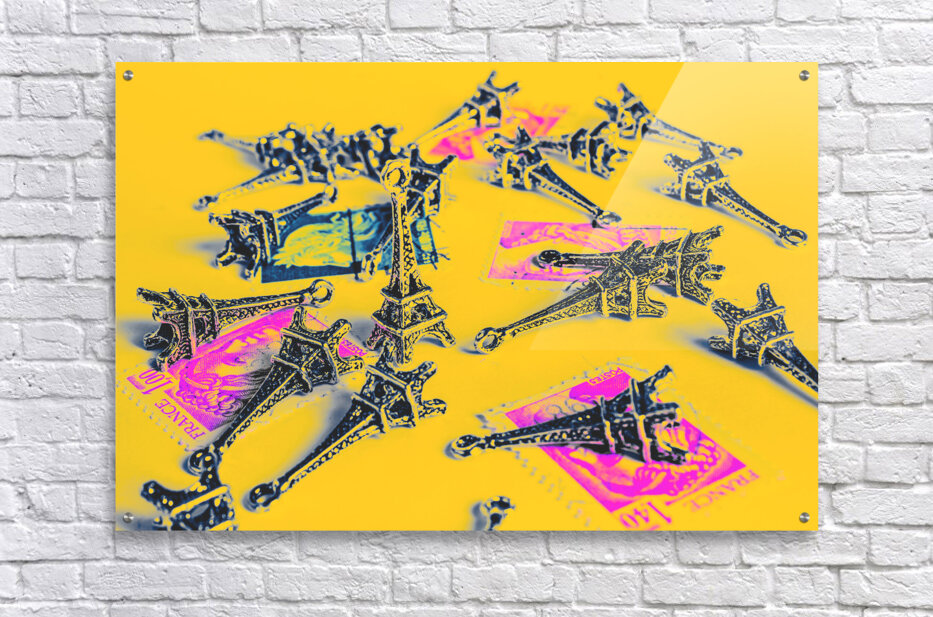 Creative still life composition on a popart mix of nostalgic stamps and little landmarks. France romance