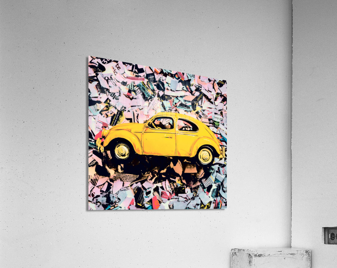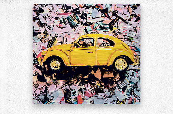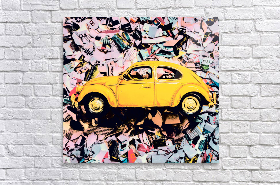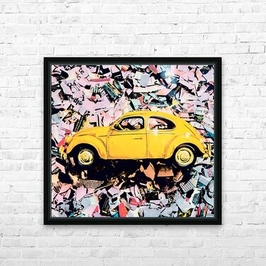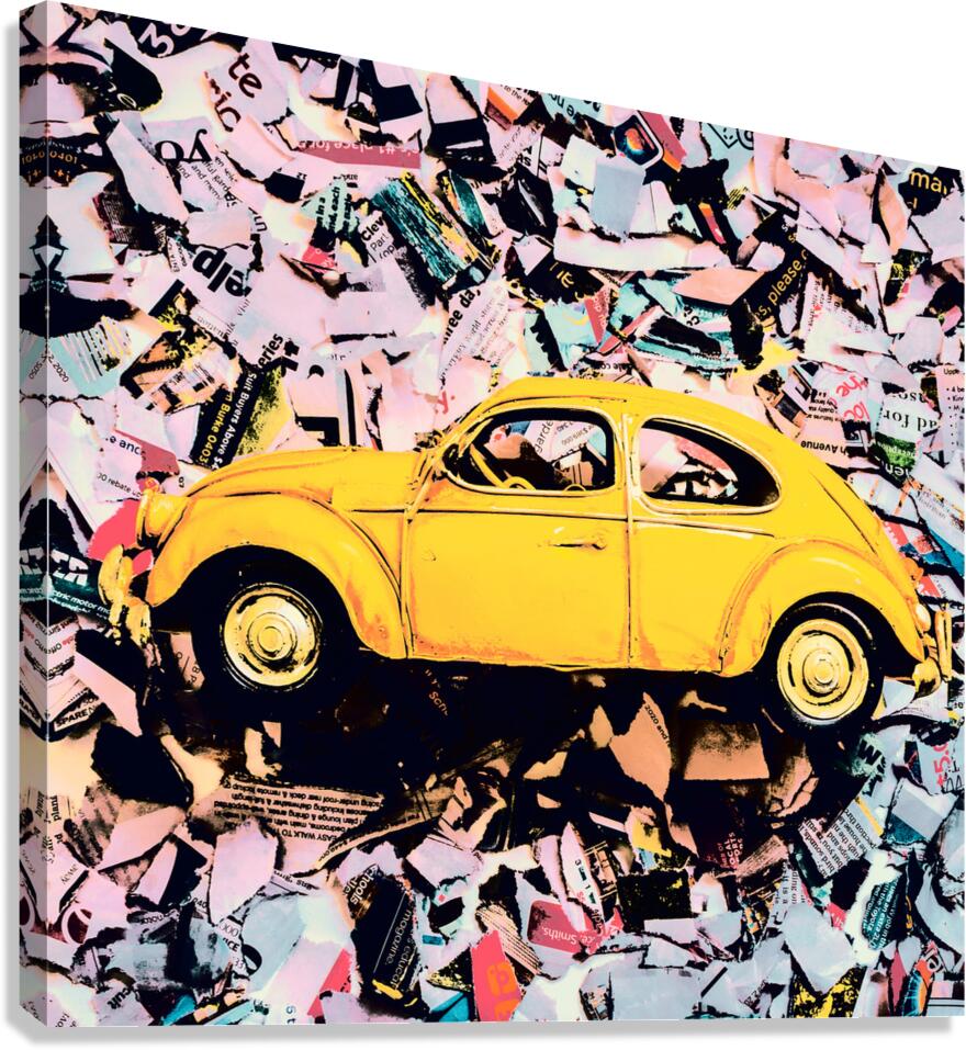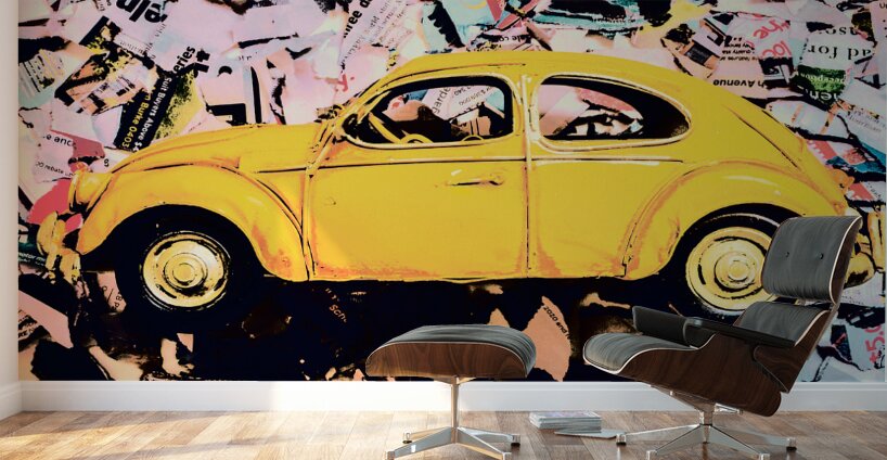 Pop art design on an urban wall of news print strips and posterized toy cars. Beetle St.