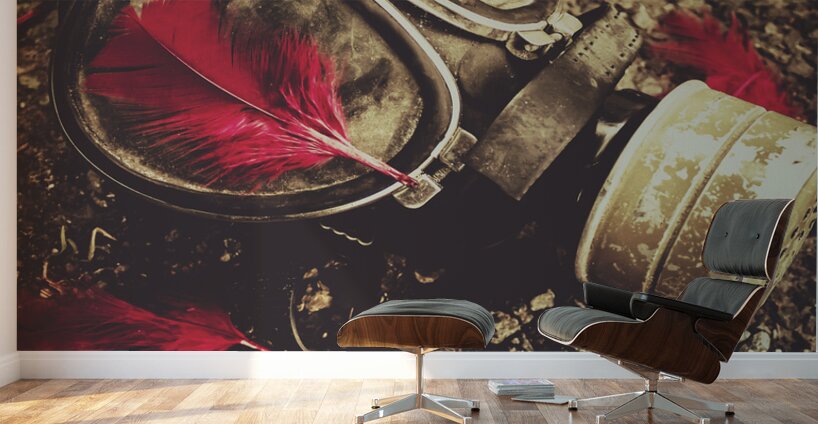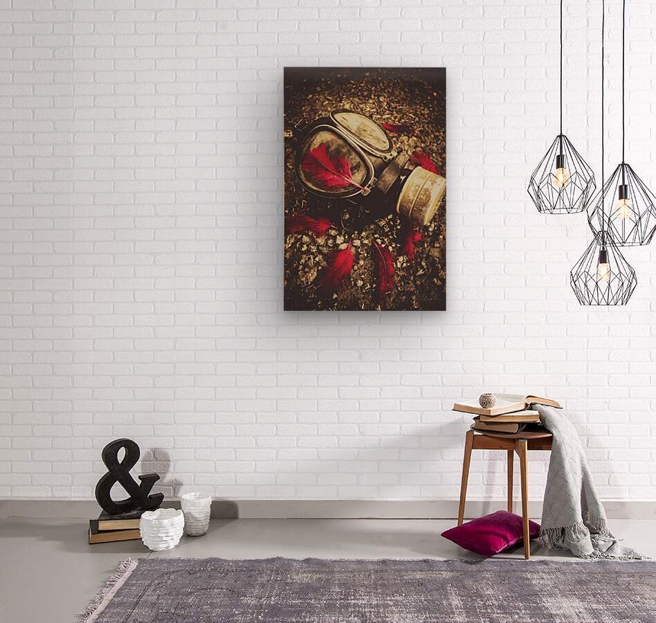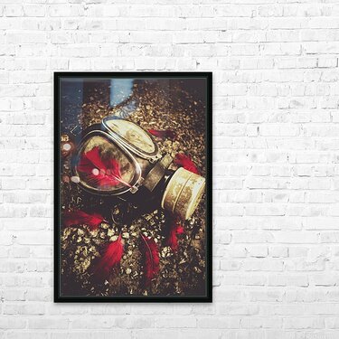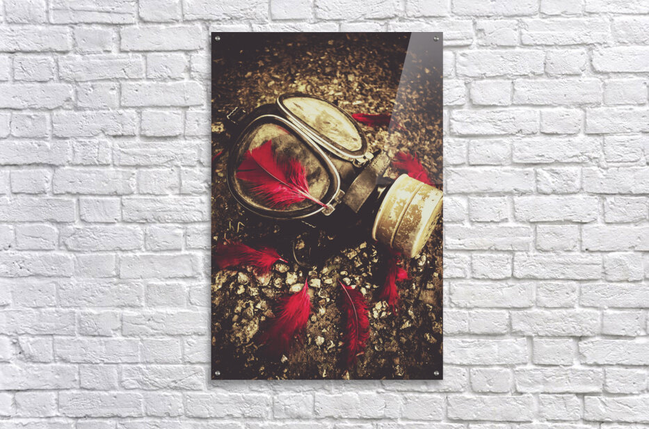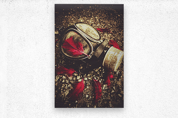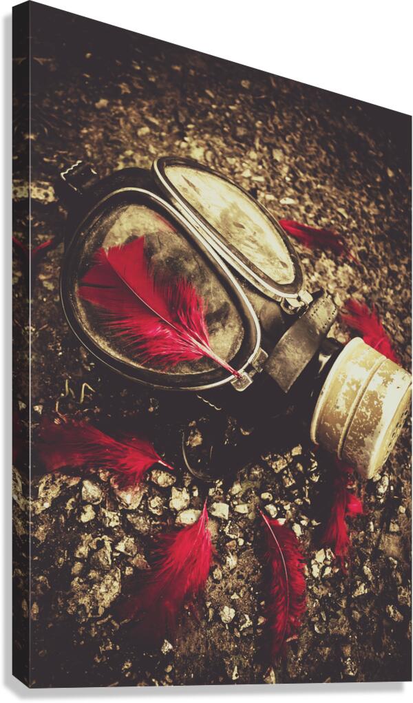 Military still life photograph on a gas mask sorrounded by rememberance red feathers. Lost to the war