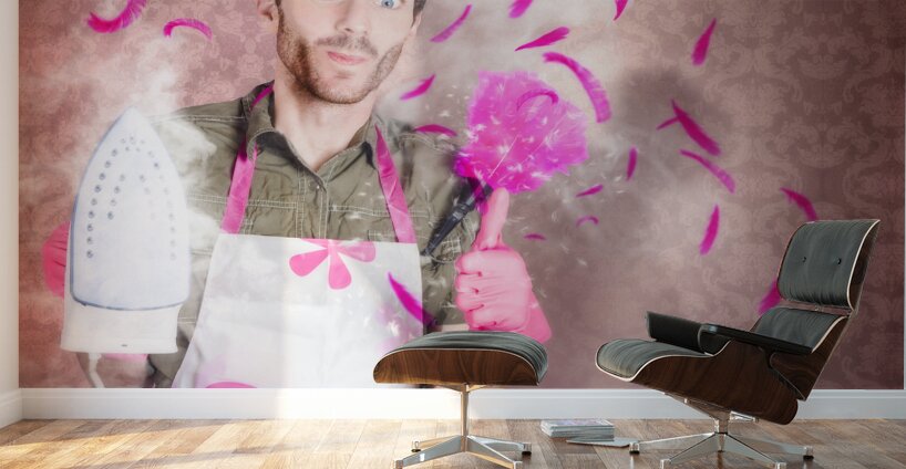 Funny creative portrait of a cleaning man dressed in feminine housework apron and gloves giving thumbs up with cheeky smile while holding hot iron and pink feather duster