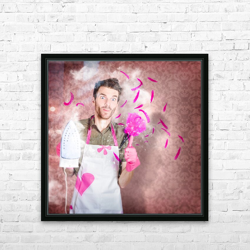 Funny cleaning man doing housework chores Frame print