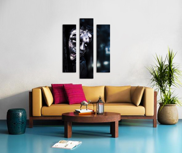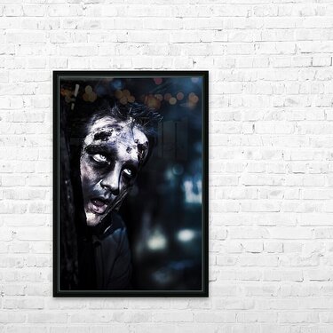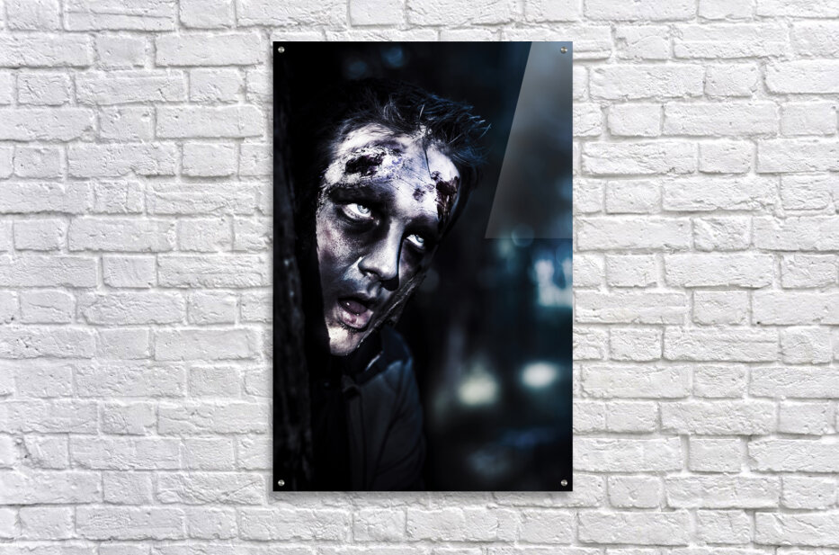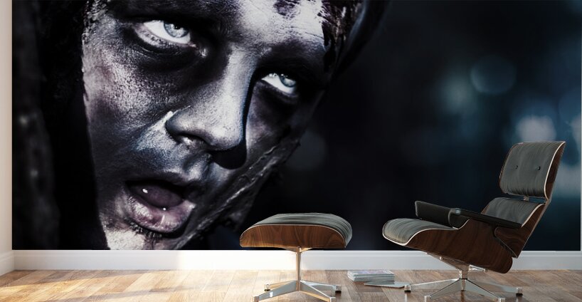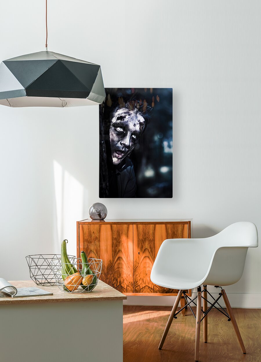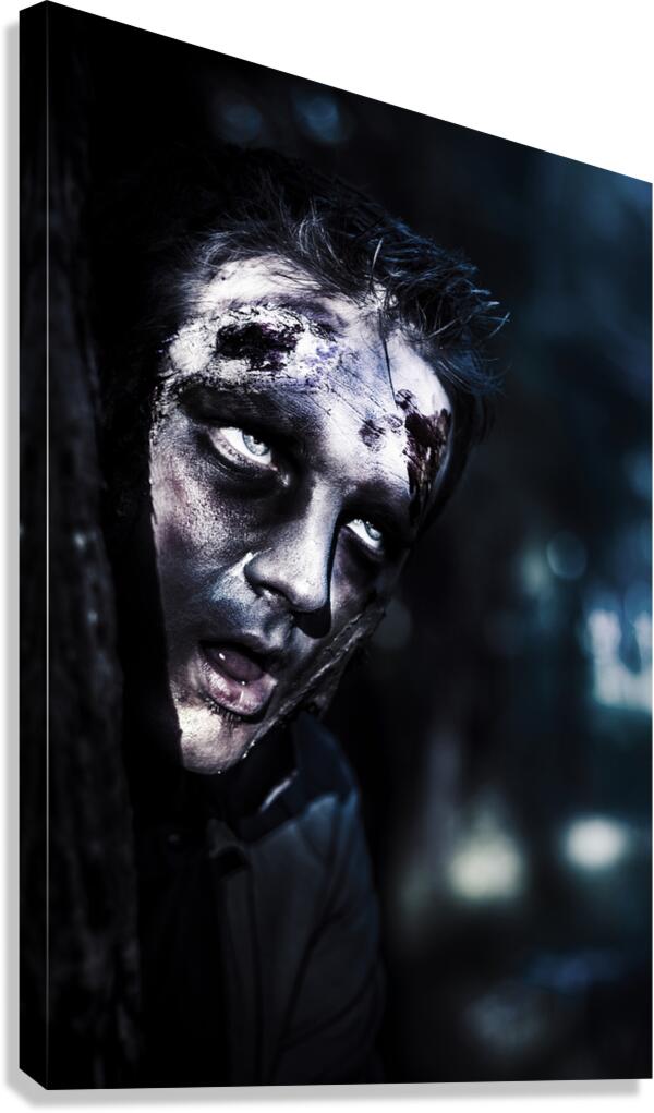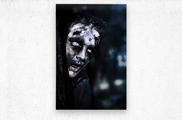 ABOUT THIS ARTWORK: HEAD OF A SCARY ZOMBIE PEEKING FROM BEHIND TREE