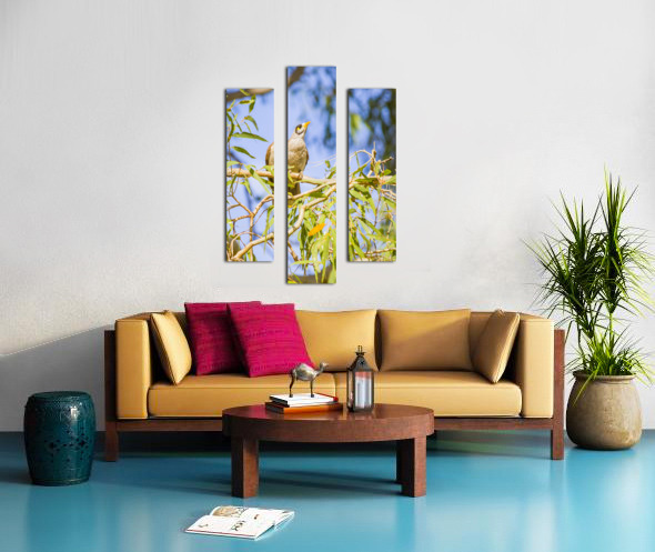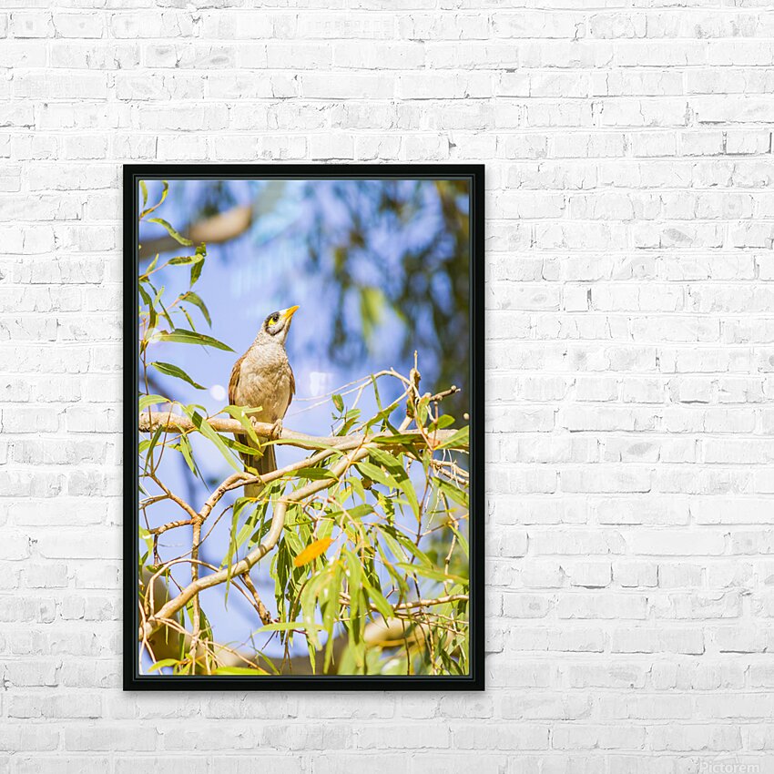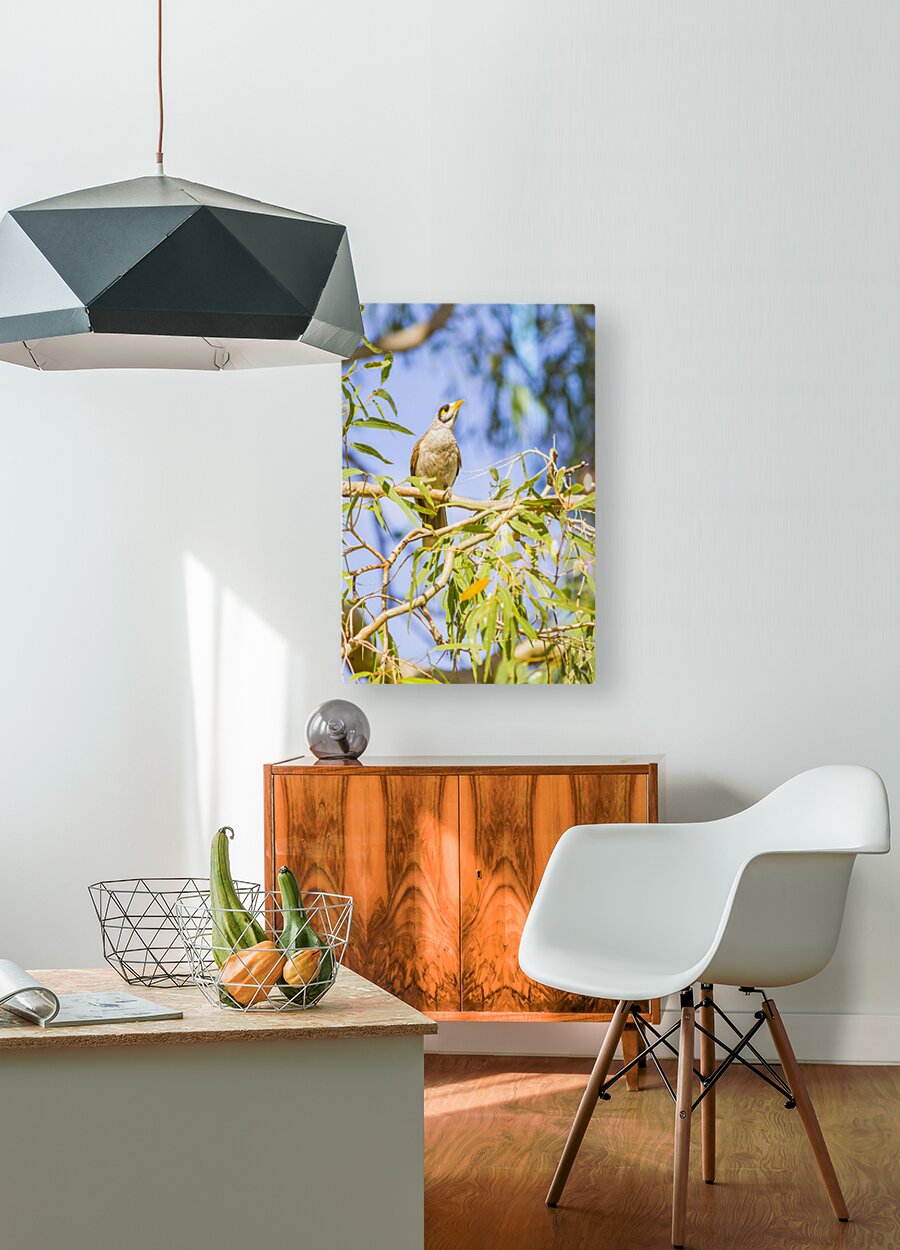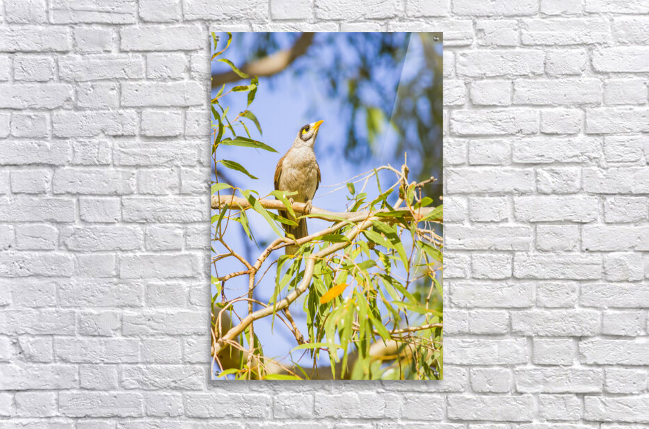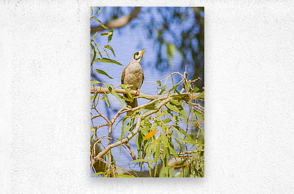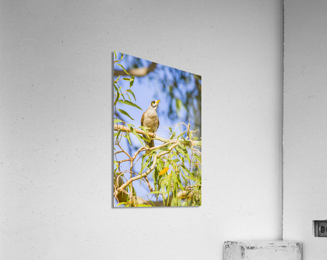 Queensland wildlife photography with a common Noisy Minor bird on colourful eucalyptus tree. Taken: Deception Bay Australia